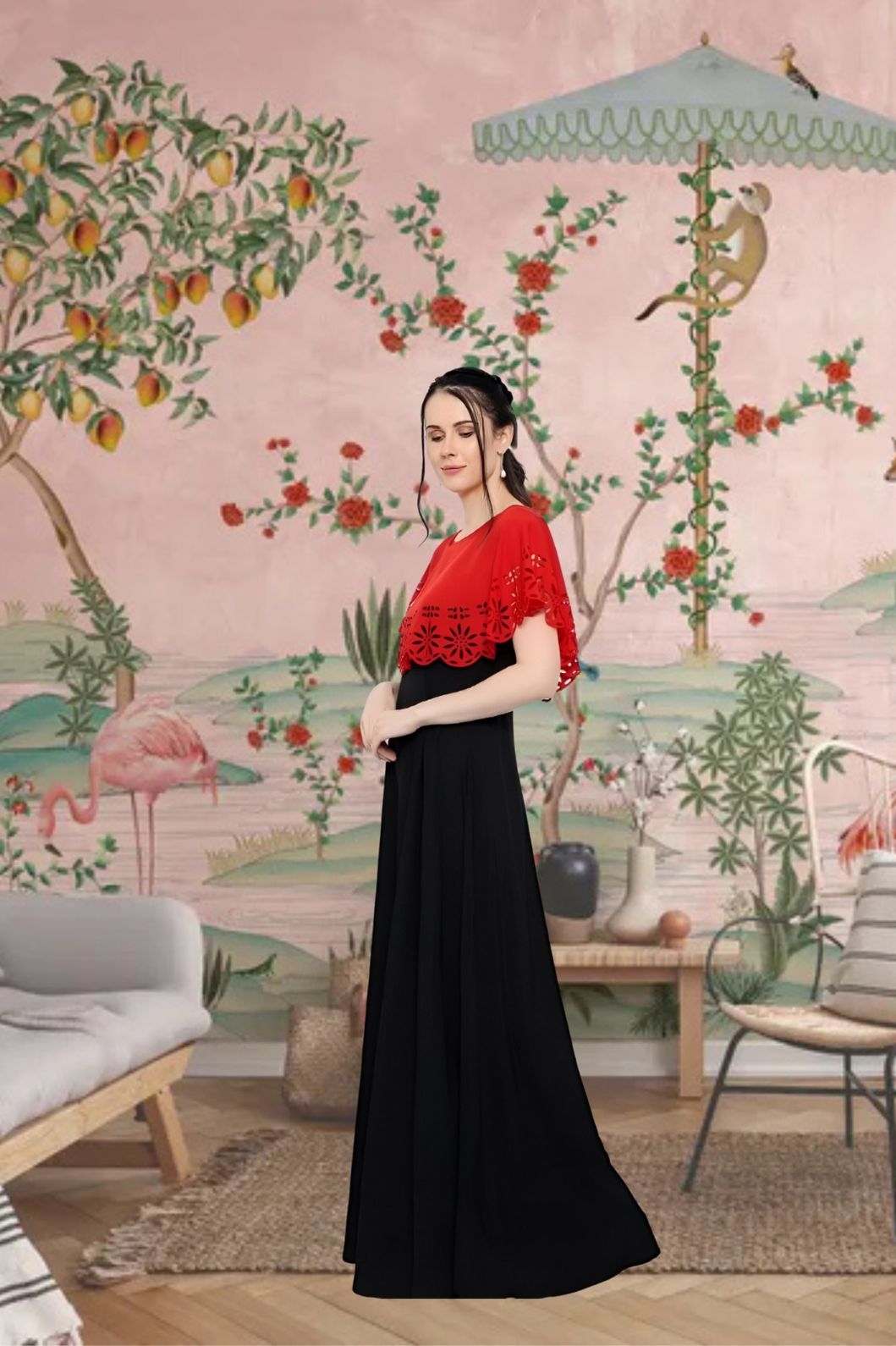 Power, passion, and pure poise — the AgniRaag gown channels the blazing drama of red against the depth of black. This full-length sleeveless crepe piece is sculpted for the woman who doesn't ask for attention — she commands it.