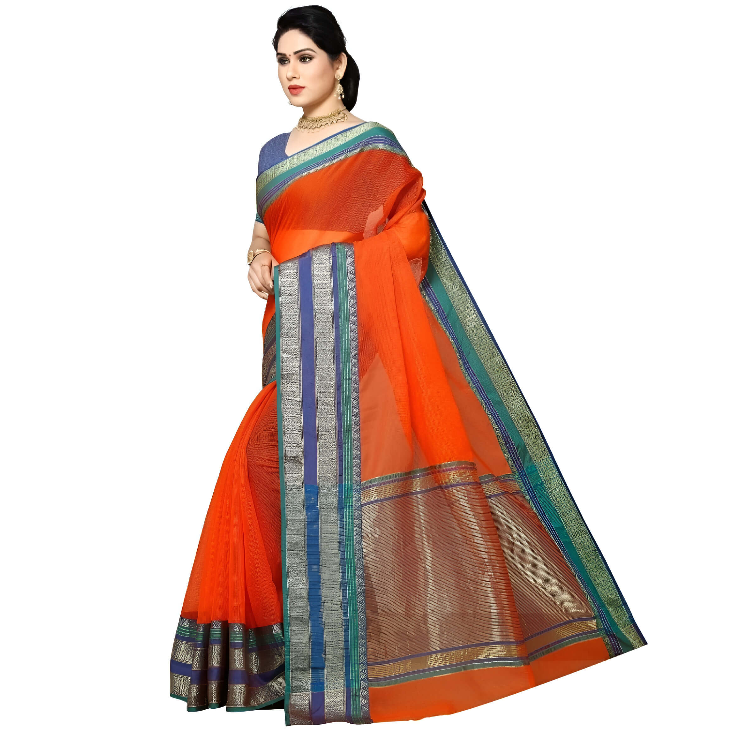Woven from the air-light threads of Kota Doria, the amber-orange body flickers like the golden hour itself, while the multicolor border weaves a tale of palatial traditions—modernized for today's goddess.