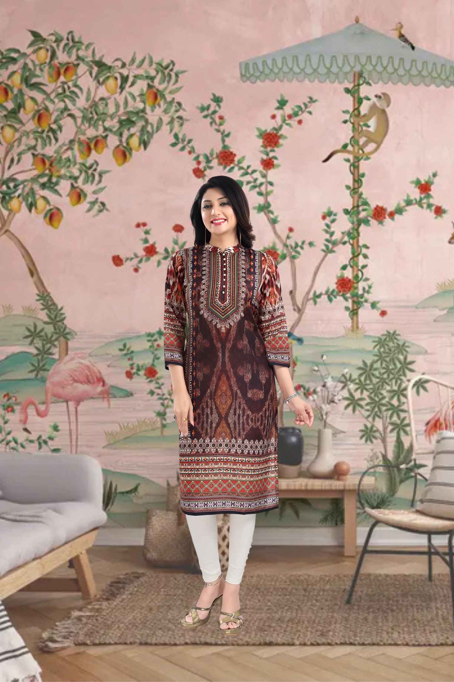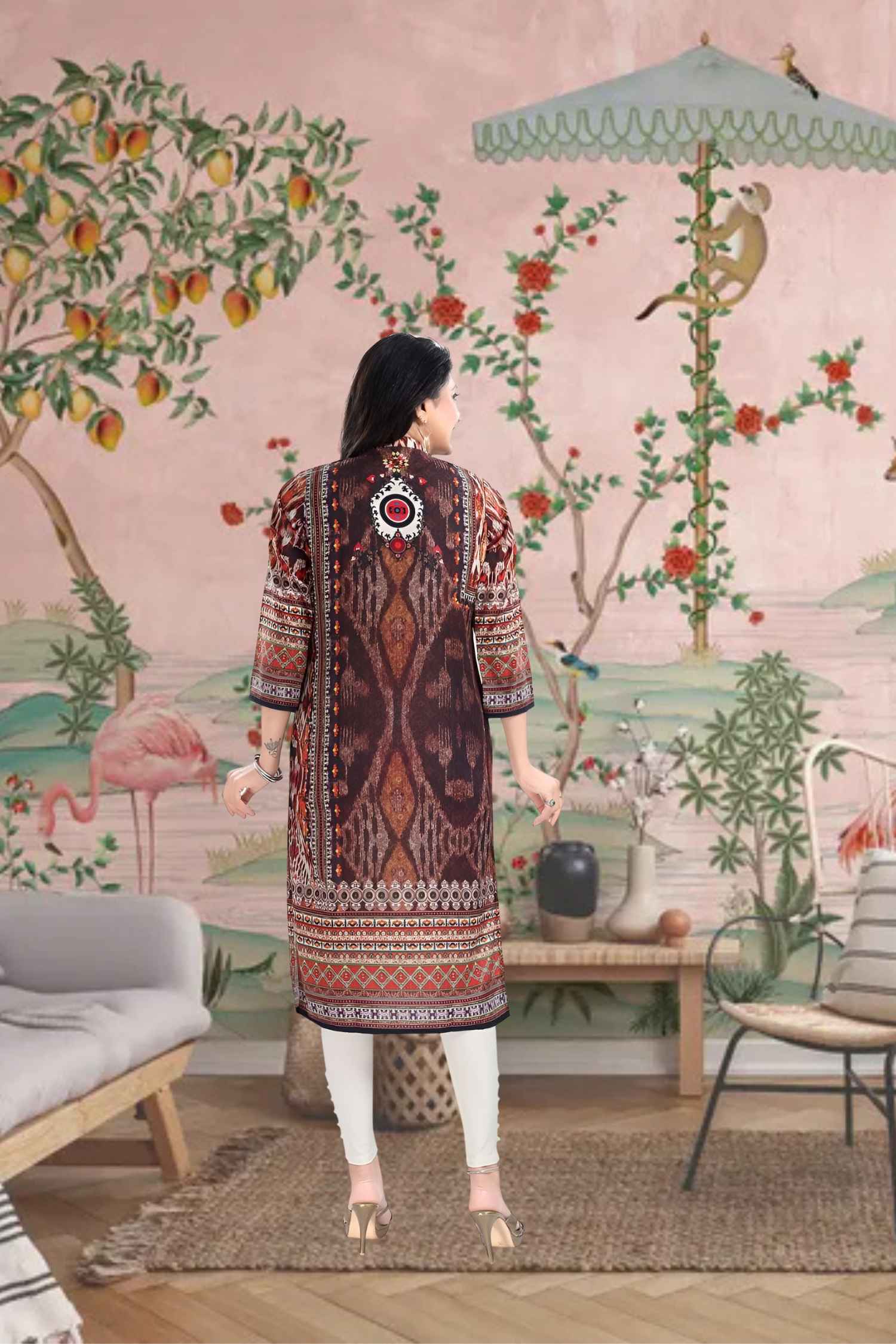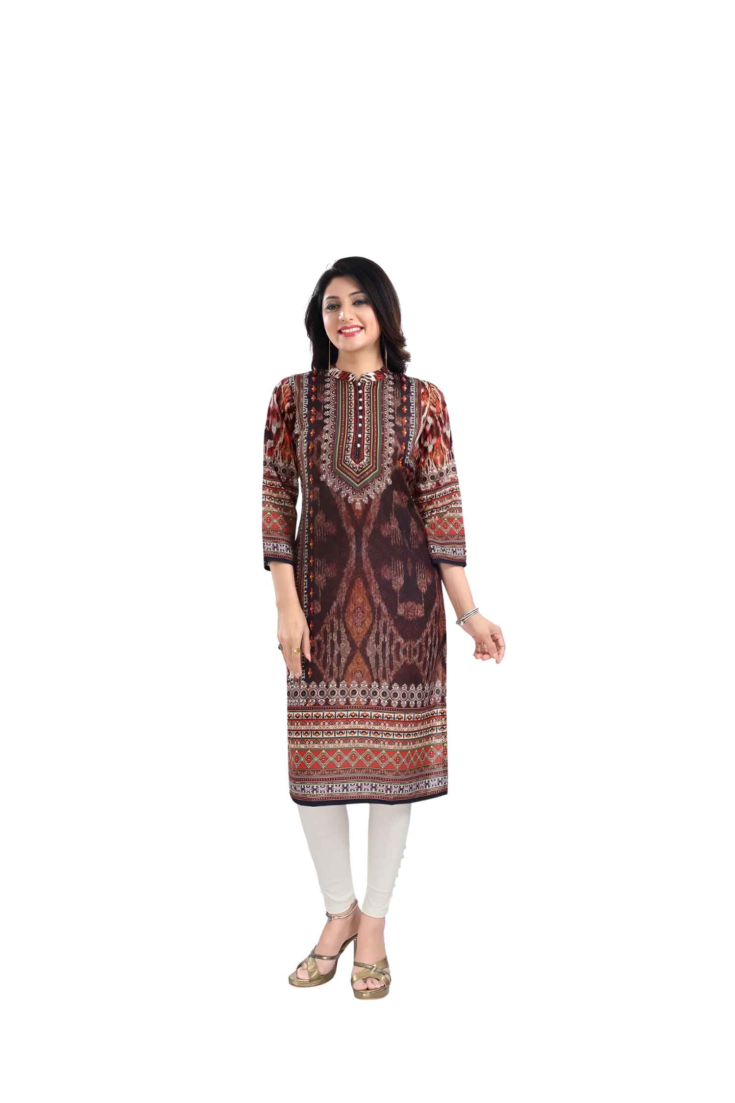 This kurti moves like a heat mirage… 3/4 sleeves that trap golden hour in their folds, a hemline cut to mimic dune crests, and a hue stolen from cinnamon sticks mid-grind. For those who wear the earth's slow songs.