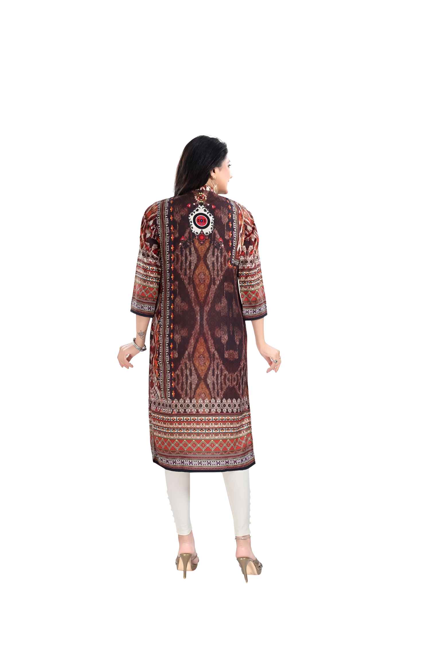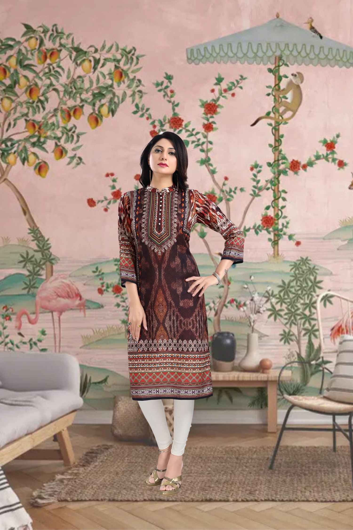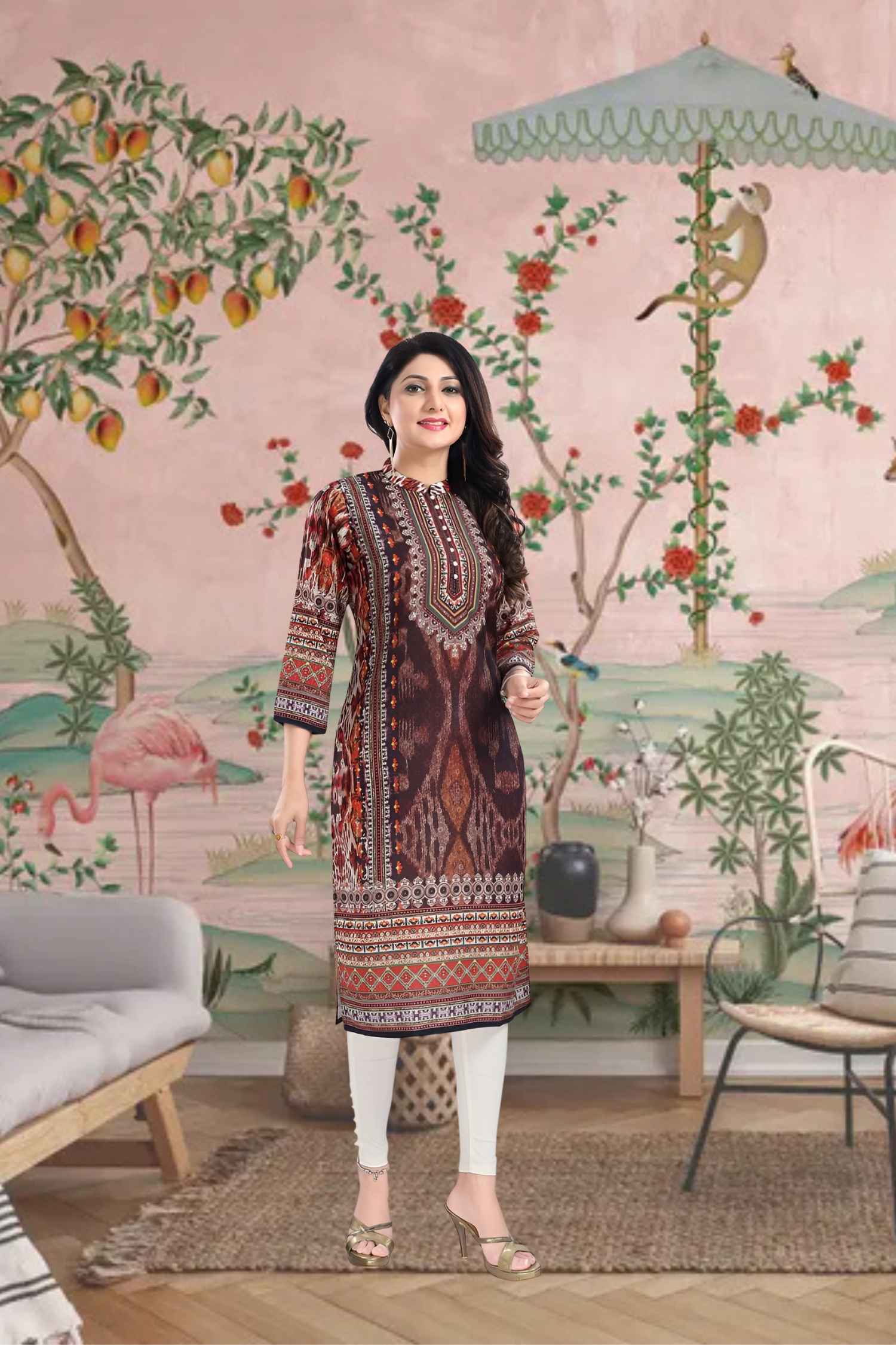 This kurti moves like a heat mirage… 3/4 sleeves that trap golden hour in their folds, a hemline cut to mimic dune crests, and a hue stolen from cinnamon sticks mid-grind. For those who wear the earth's slow songs.