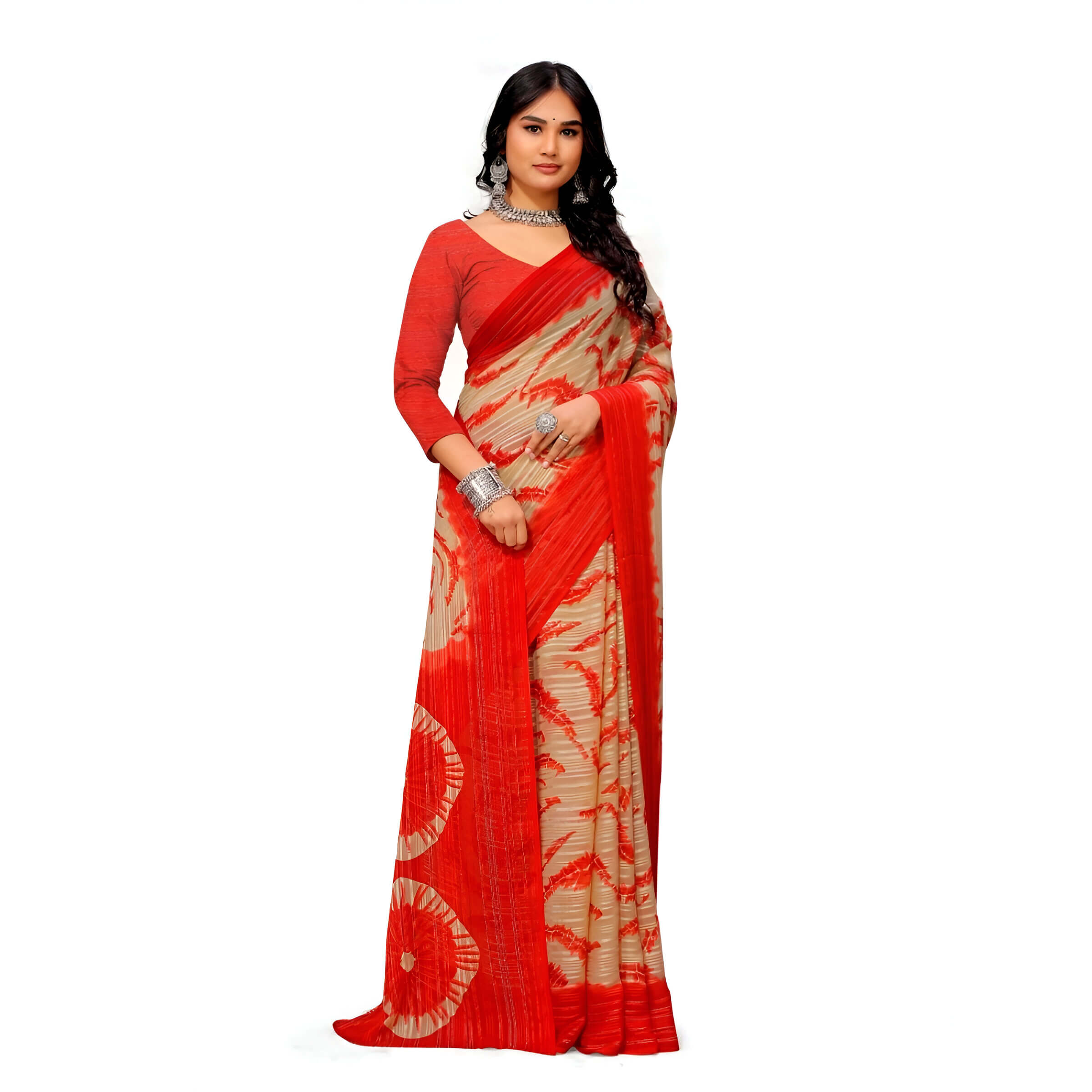 For the woman who dances between vibrancy and subtlety, this red-and-cream georgette saree is your color-shifting chameleon. The abstract patterns emerge like half-remembered dreams against the dual-tone fabric, making every drape uniquely yours.