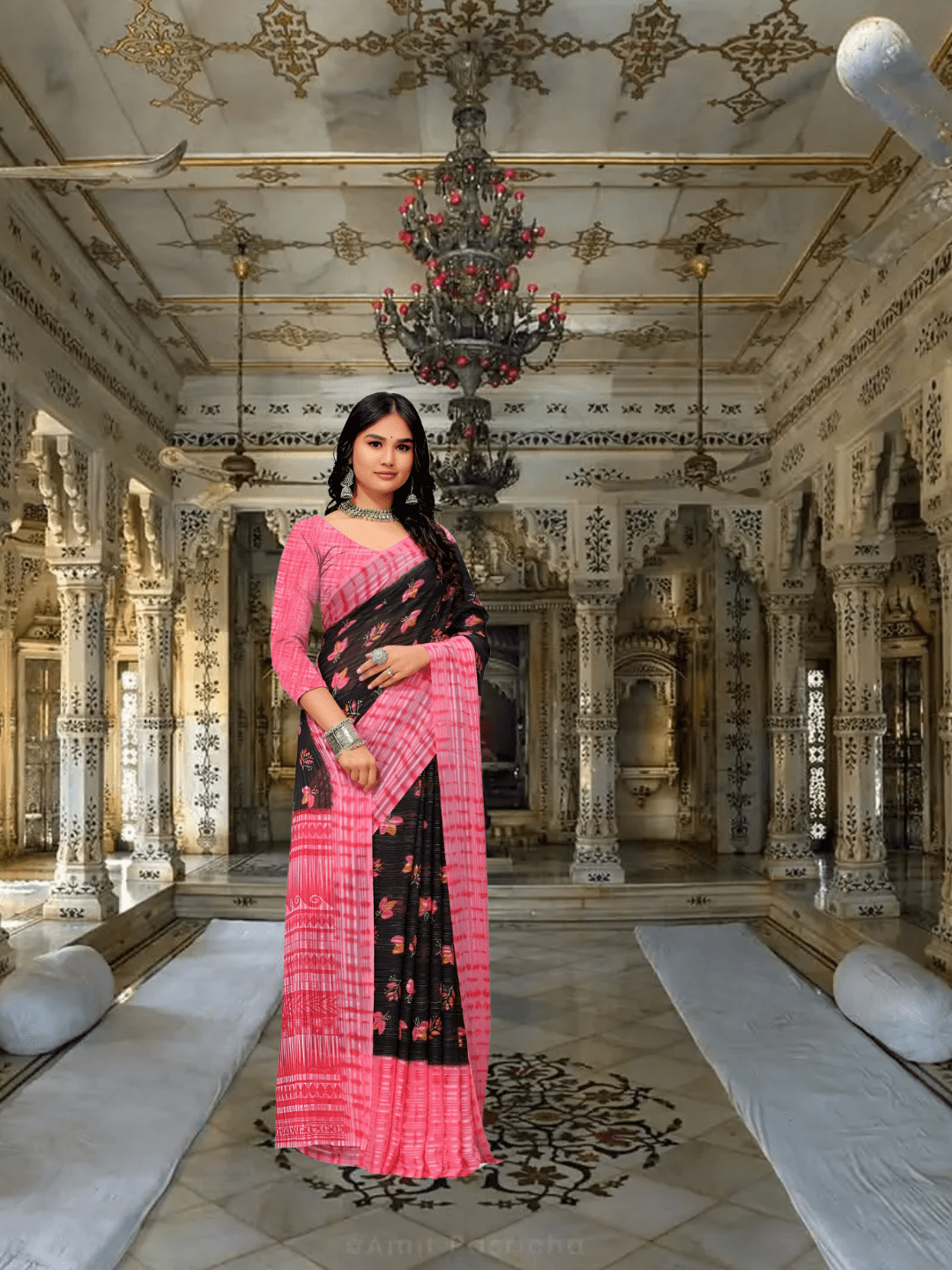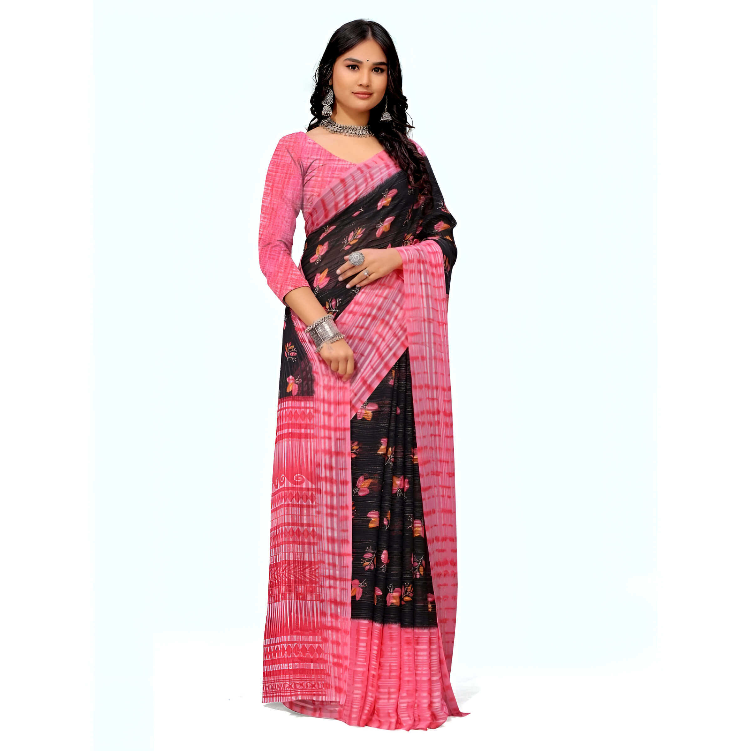 For the woman who embraces both her softness and strength, this pink-and-black georgette saree is your wearable love letter with a secret. The blushing pink base dances with delicate black lace-like patterns – like vintage romance meets modern edge.