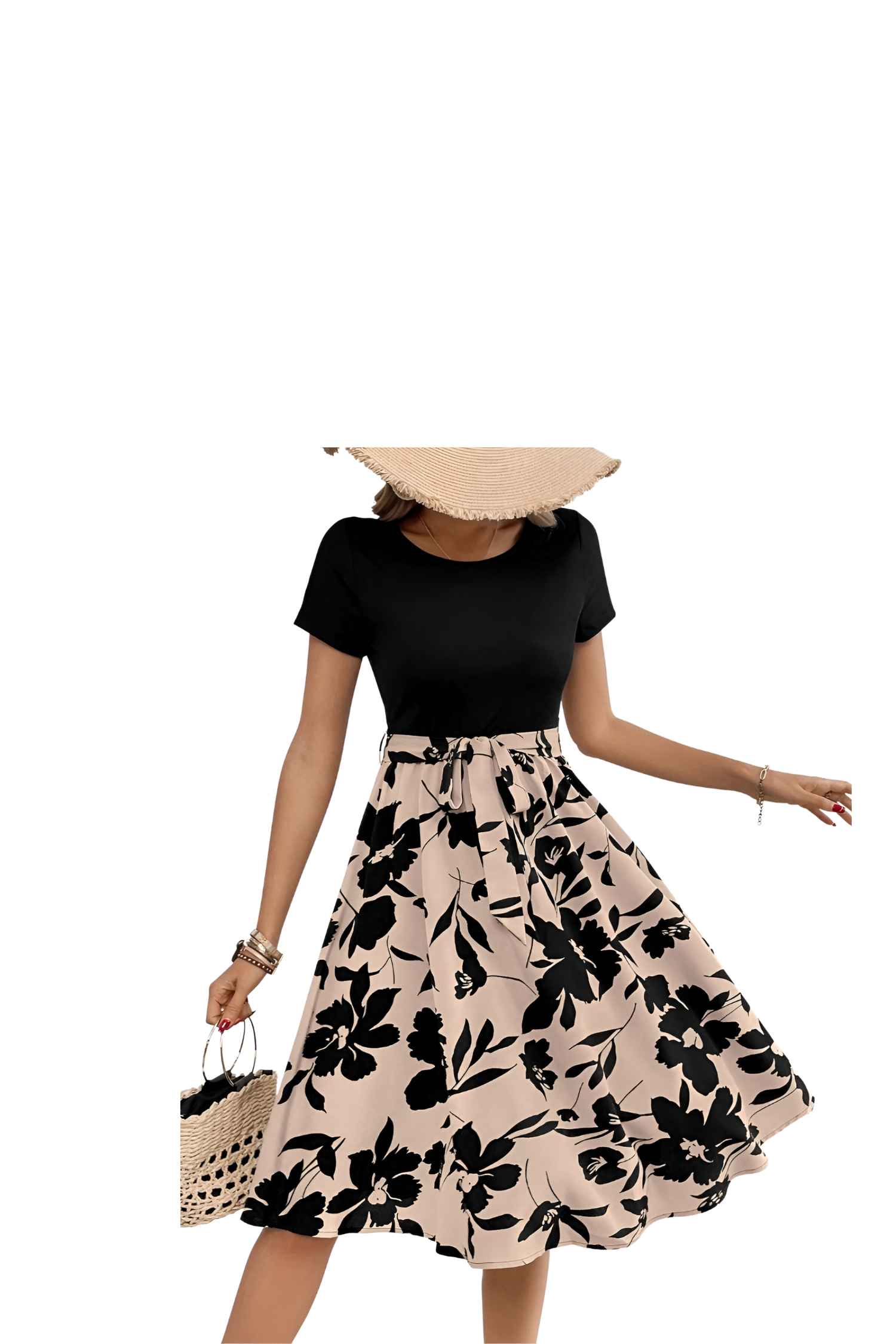 A classic round neck, short sleeves, and that two-tone drama—black on top, cream below, blooming with graceful leaves and soft floral dreams. 🌿🌸