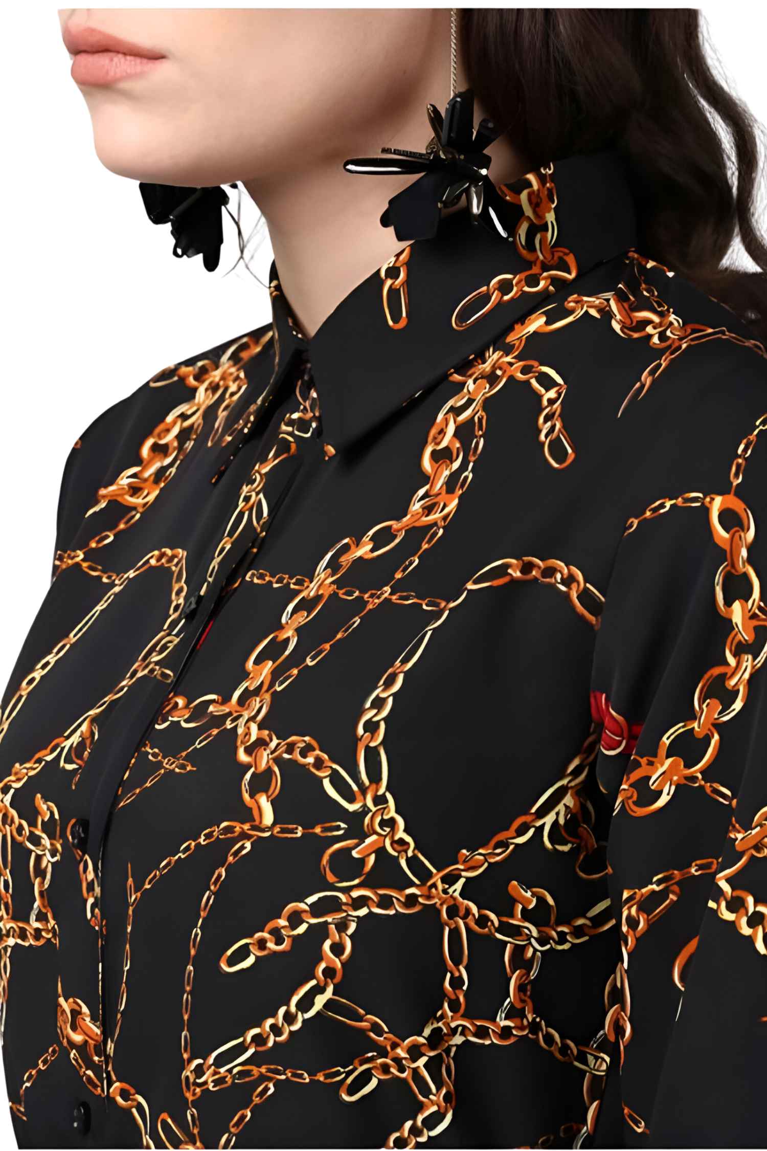 The Chain Reaction doesn’t just accessorize—it rewires the system. A black polyester manifesto with gold chain prints that crackle like live wires against the dark.