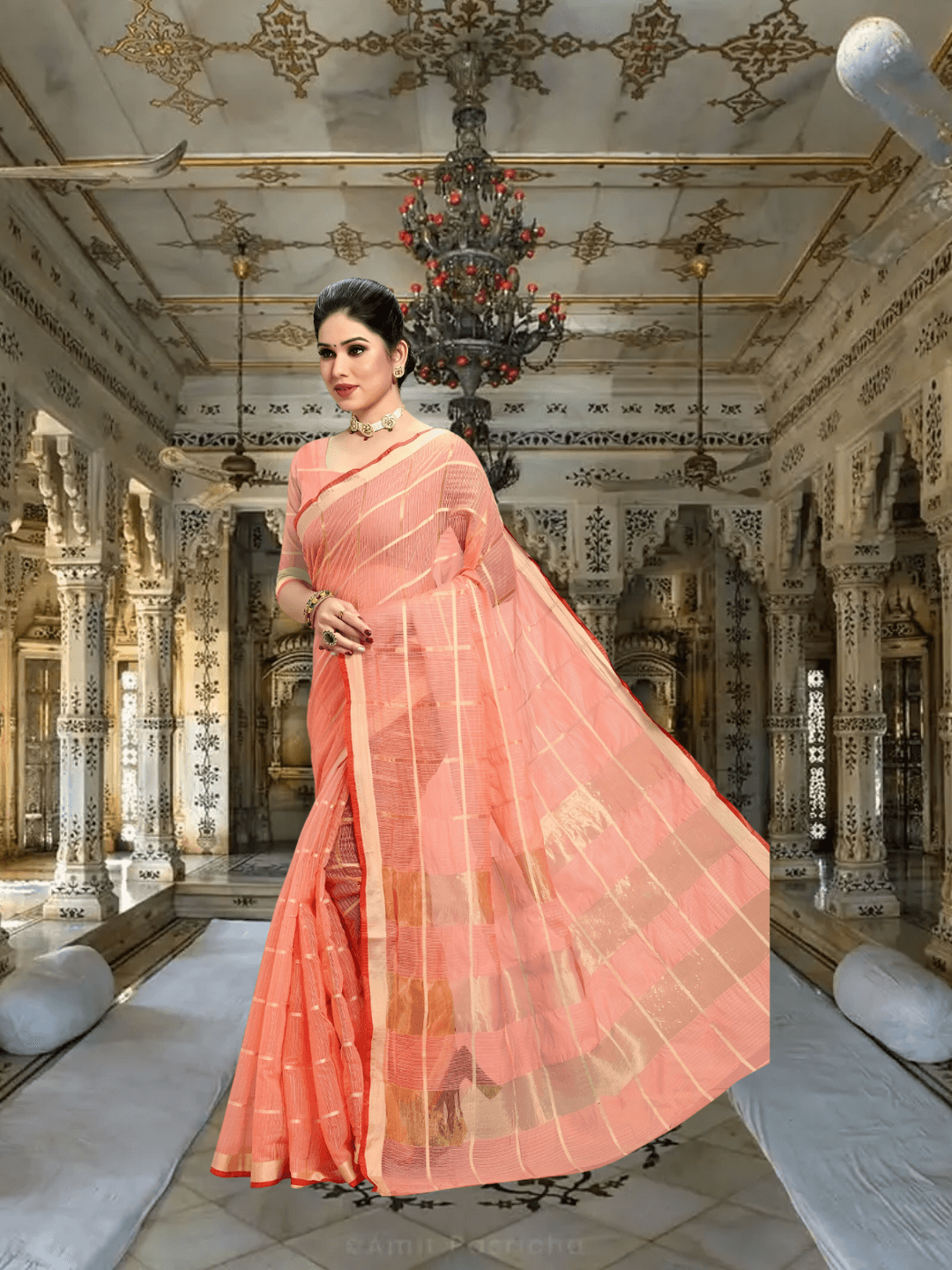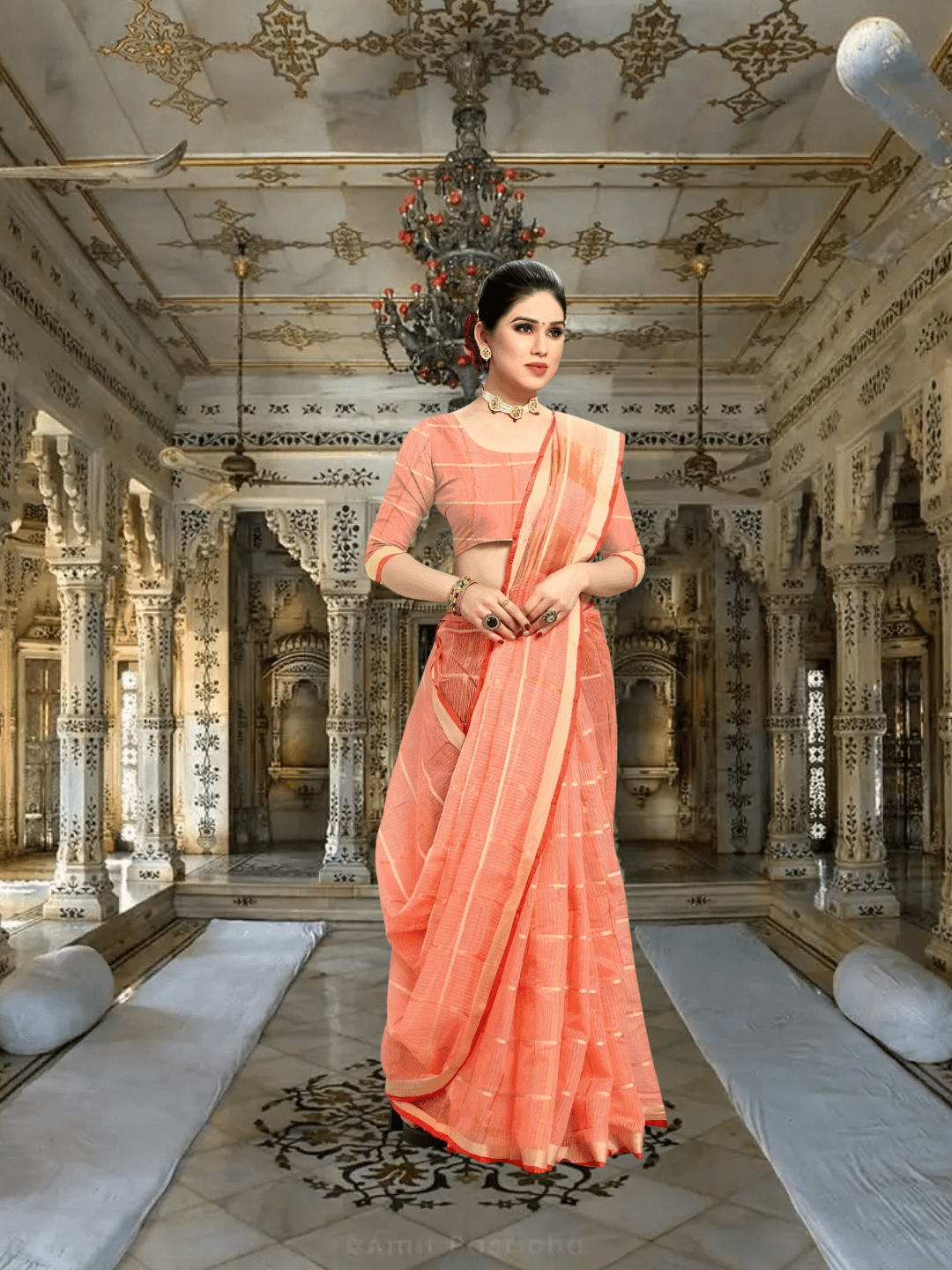 Step into grace with Chaitra Vaali – a soft-spoken beauty woven from the whisper of cotton and the tradition of Kota Doria. This peach checkered drape is as gentle as a summer bloom and as structured as your grandmother’s discipline.