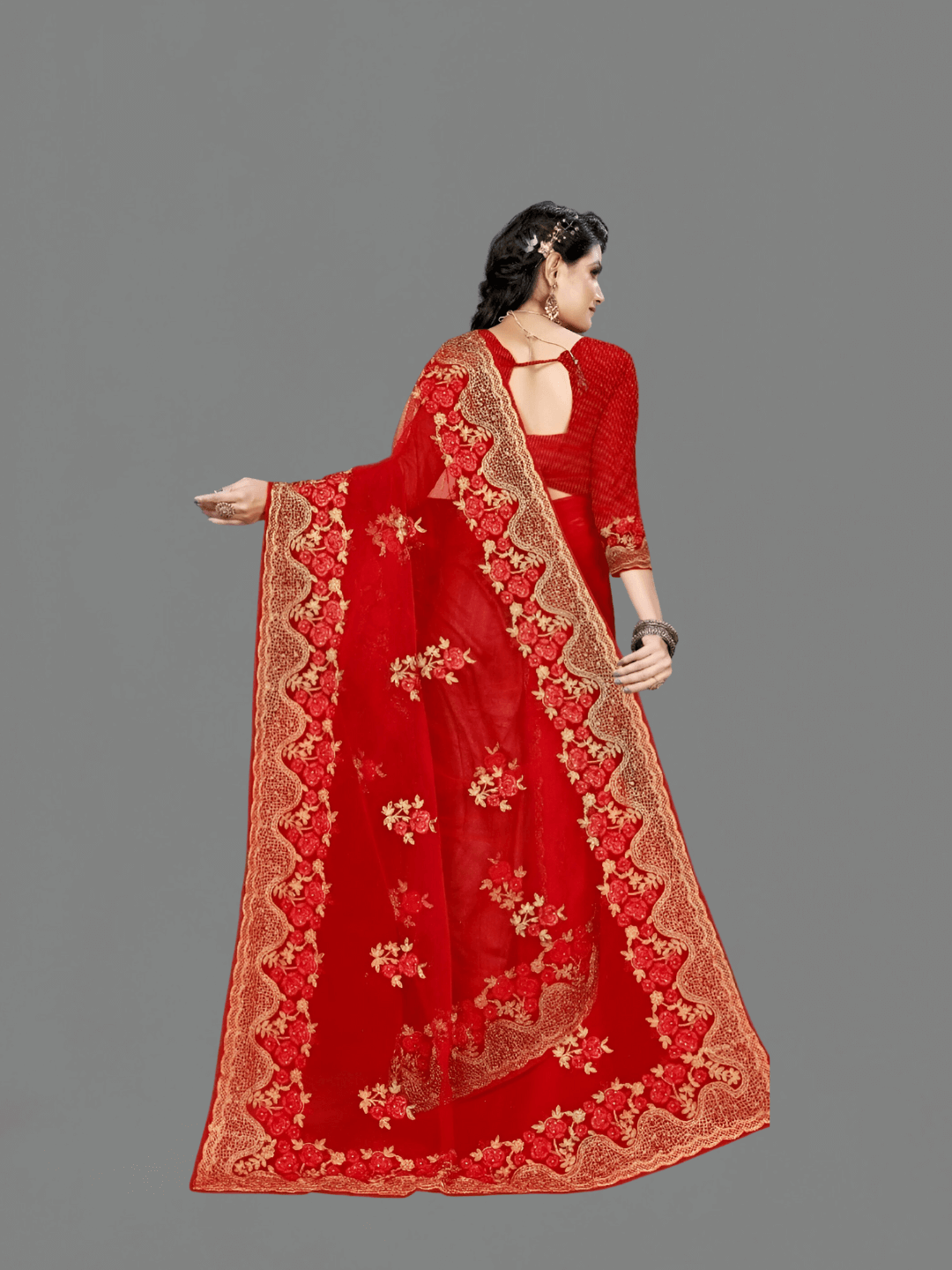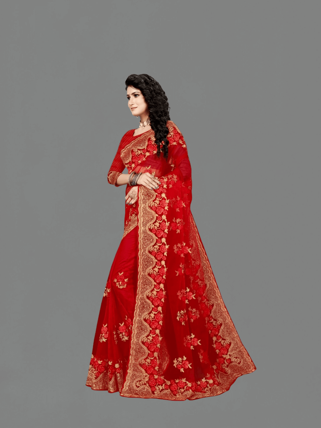 "Crimson Sonata" Netted Red Saree – Stitched In Gilded Whispers