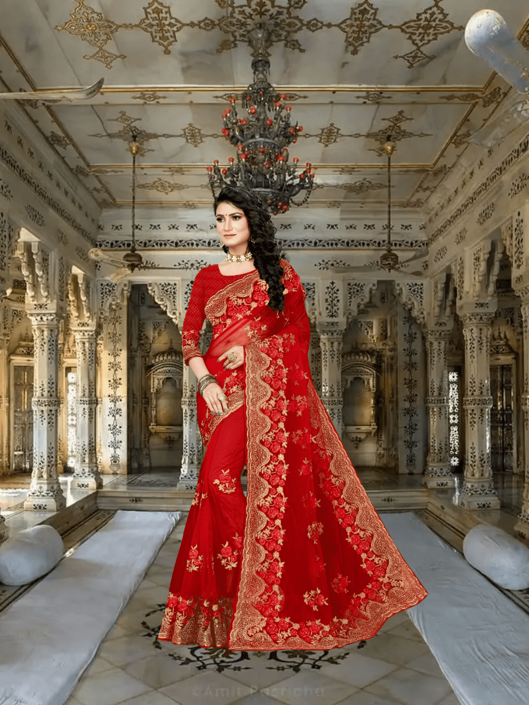 "This is the saree that drapes like a crescendo—red net so rich, it stains the air with romance, while gold embroidery trembles like firelight on old palace walls."
