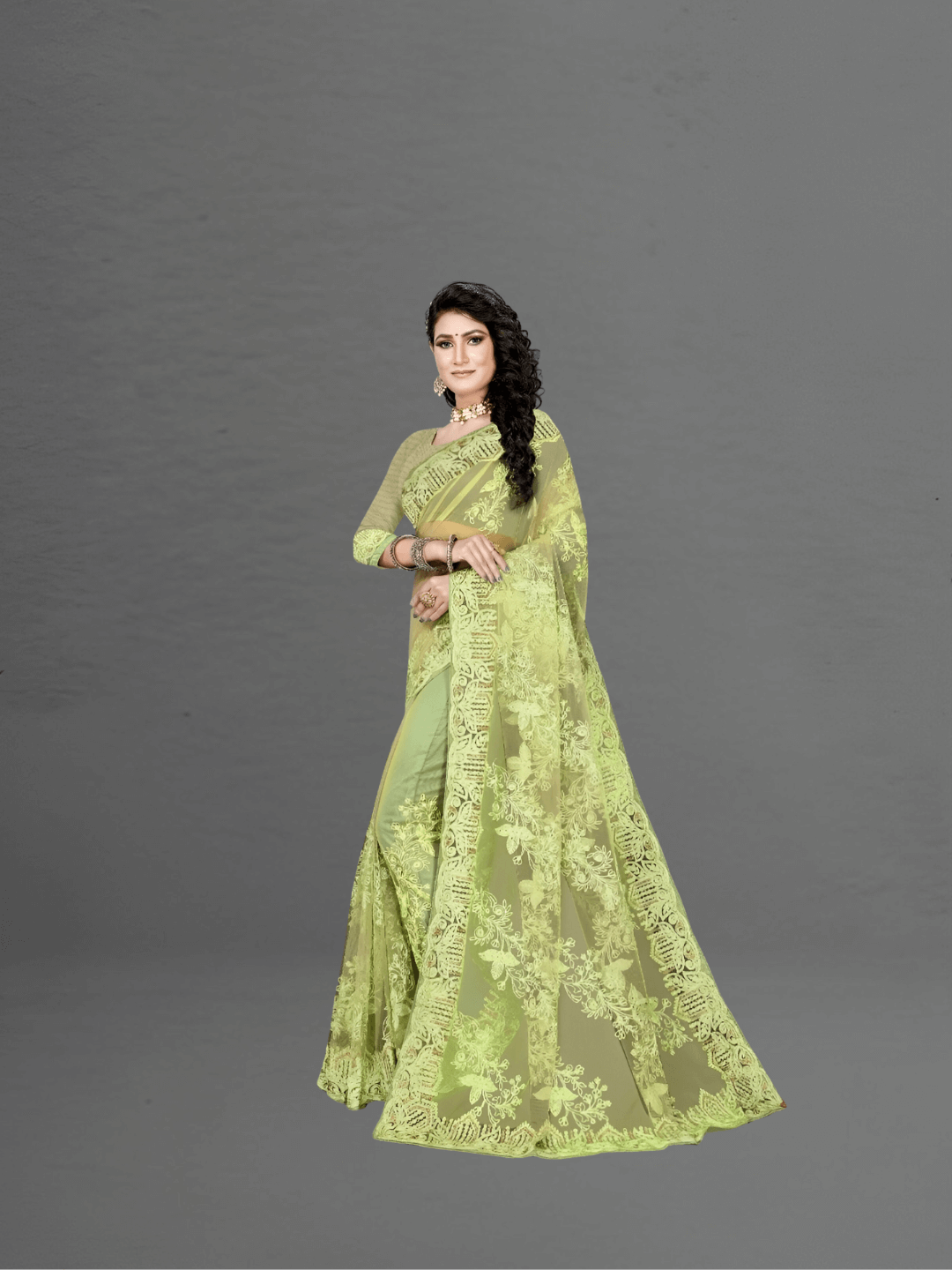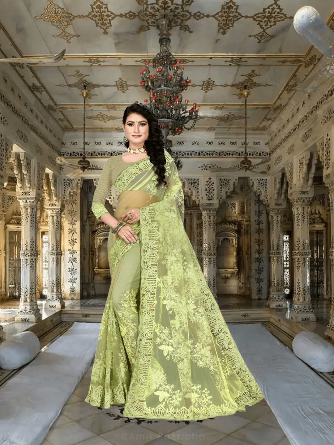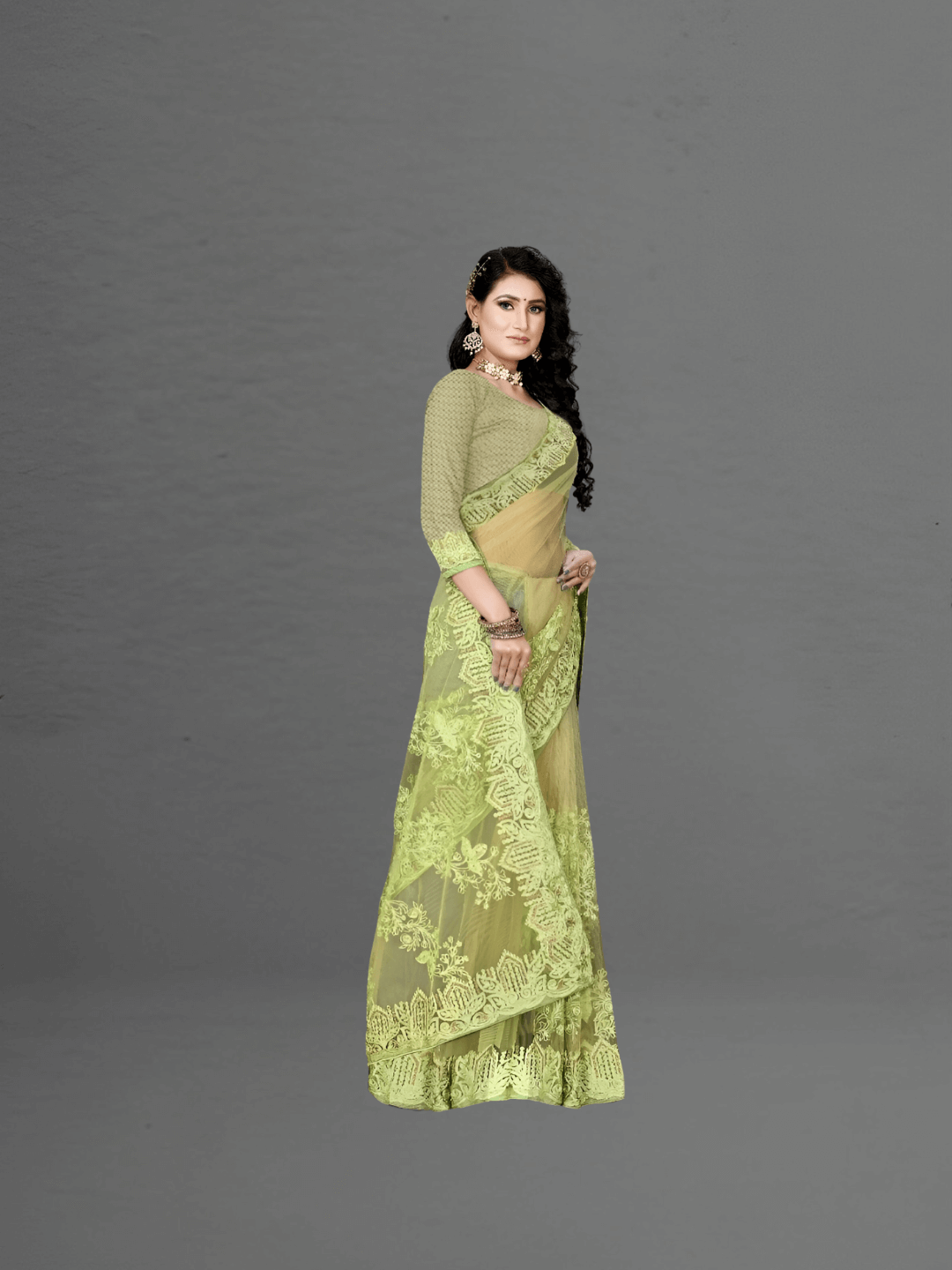 For the soul that commands attention in stillness, this pista green netted saree is a mirage of royal restraint and luxurious lightness. Hand-embroidered patterns glimmer subtly across its sheer body, while the ornate border evokes a regal hush—like velvet footsteps in a palace corridor.