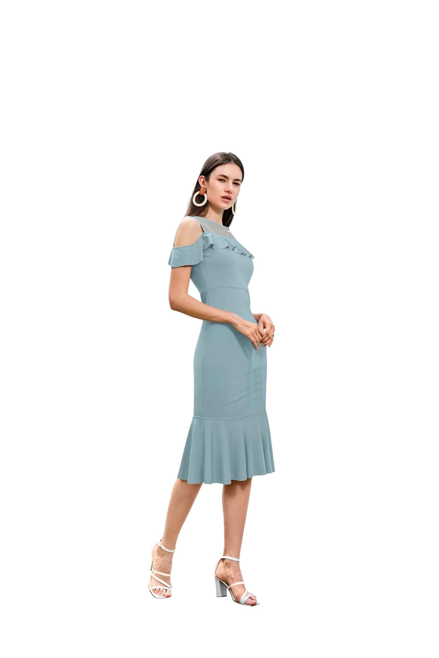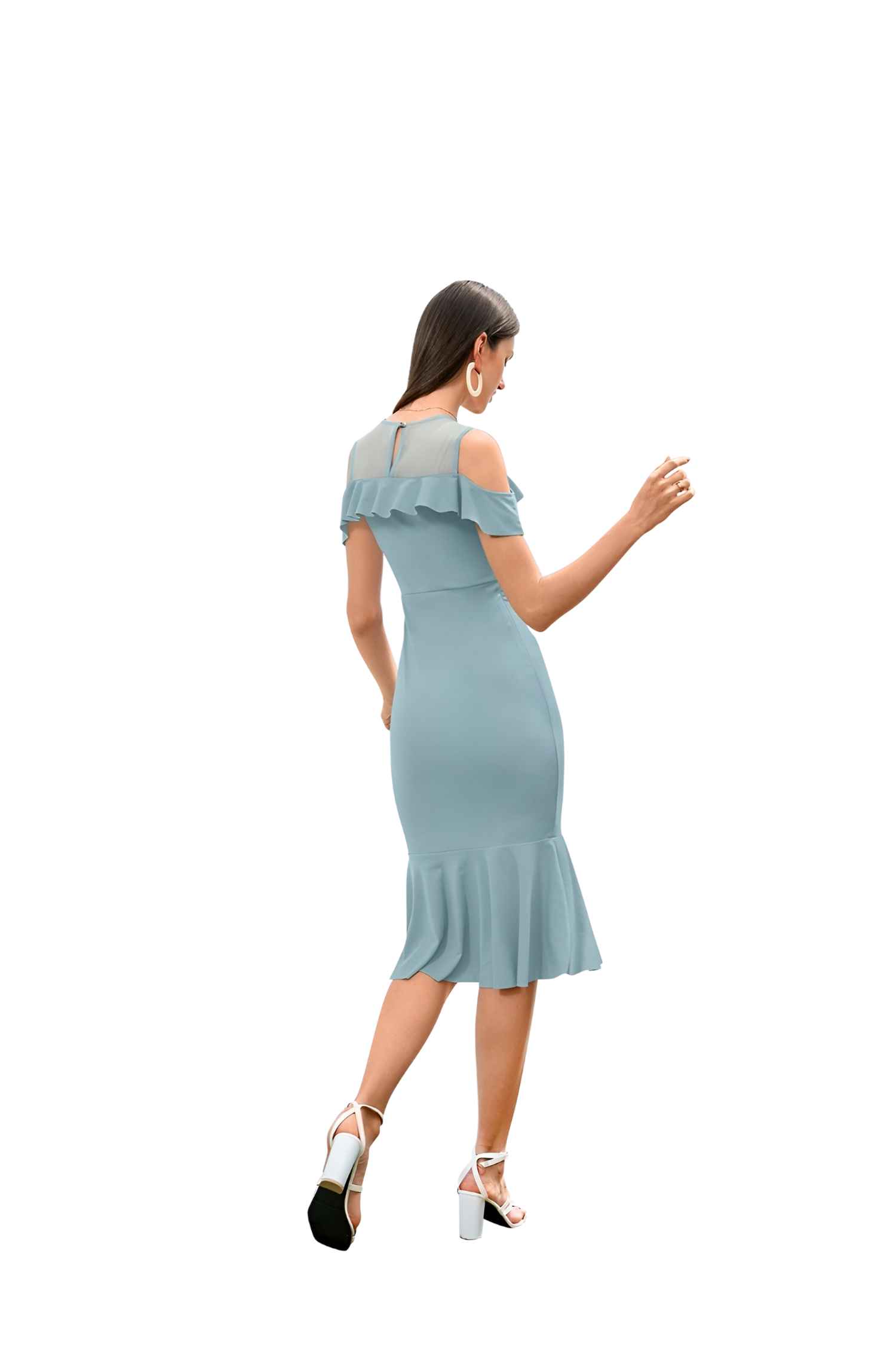 "Frost-bite" neckline – Ruffled stretch fabric frames your shoulders like winter’s first lace