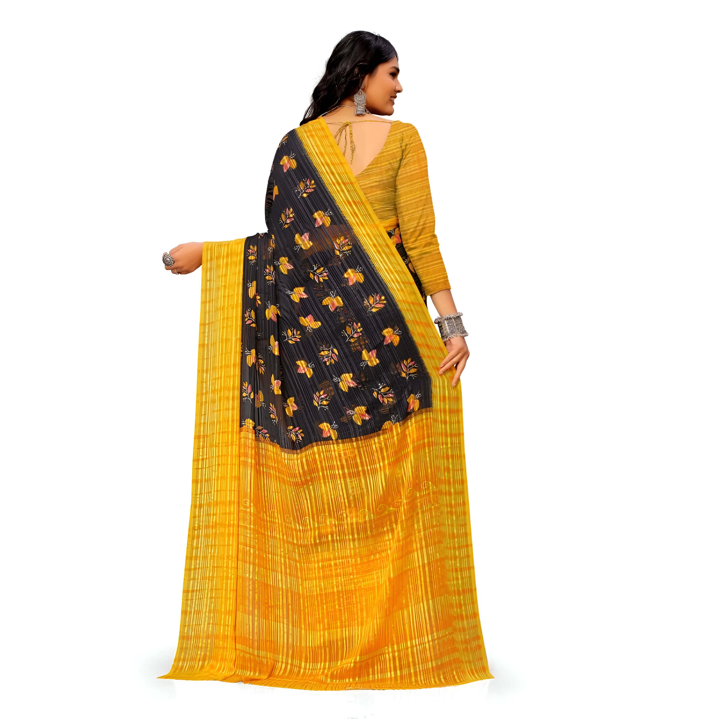 For the woman who commands attention like a solar eclipse, this yellow-and-black georgette saree is your wearable cosmic event. The vibrant golden base collides with inky black abstract patterns, creating a daring interplay of light and shadow.