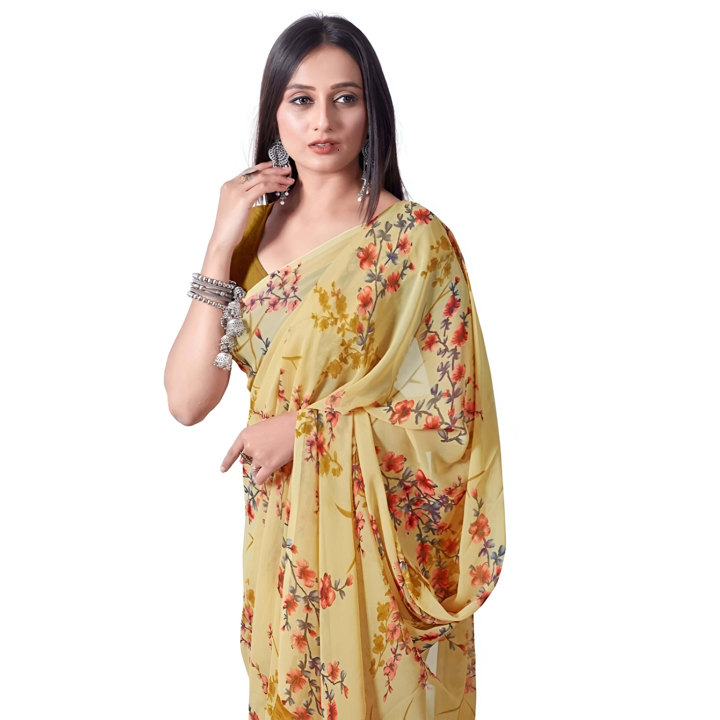 For the woman who wears her curiosity, this yellow georgette saree is your walking art installation. The vibrant golden base dances with unconventional abstract patterns – think Kandinsky painting meets Indian tradition.