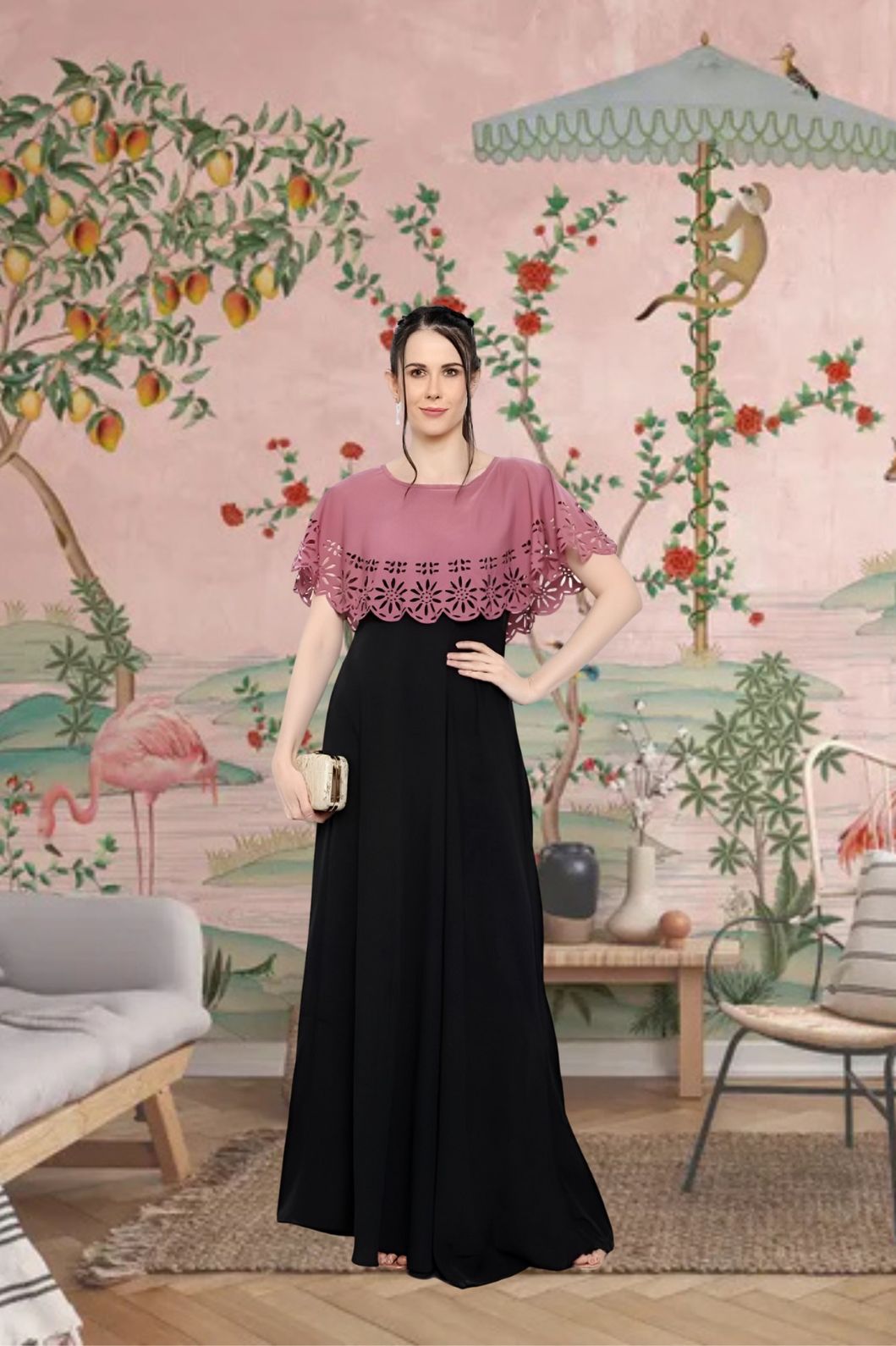 Like the last kiss of sunlight before darkness claims the sky, the Gulaabi Saanjh gown is poetry draped in fabric. This sleeveless, peach and black full-length crepe gown fuses softness and boldness — designed for women who embody contrast: calm and fierce, delicate and daring.