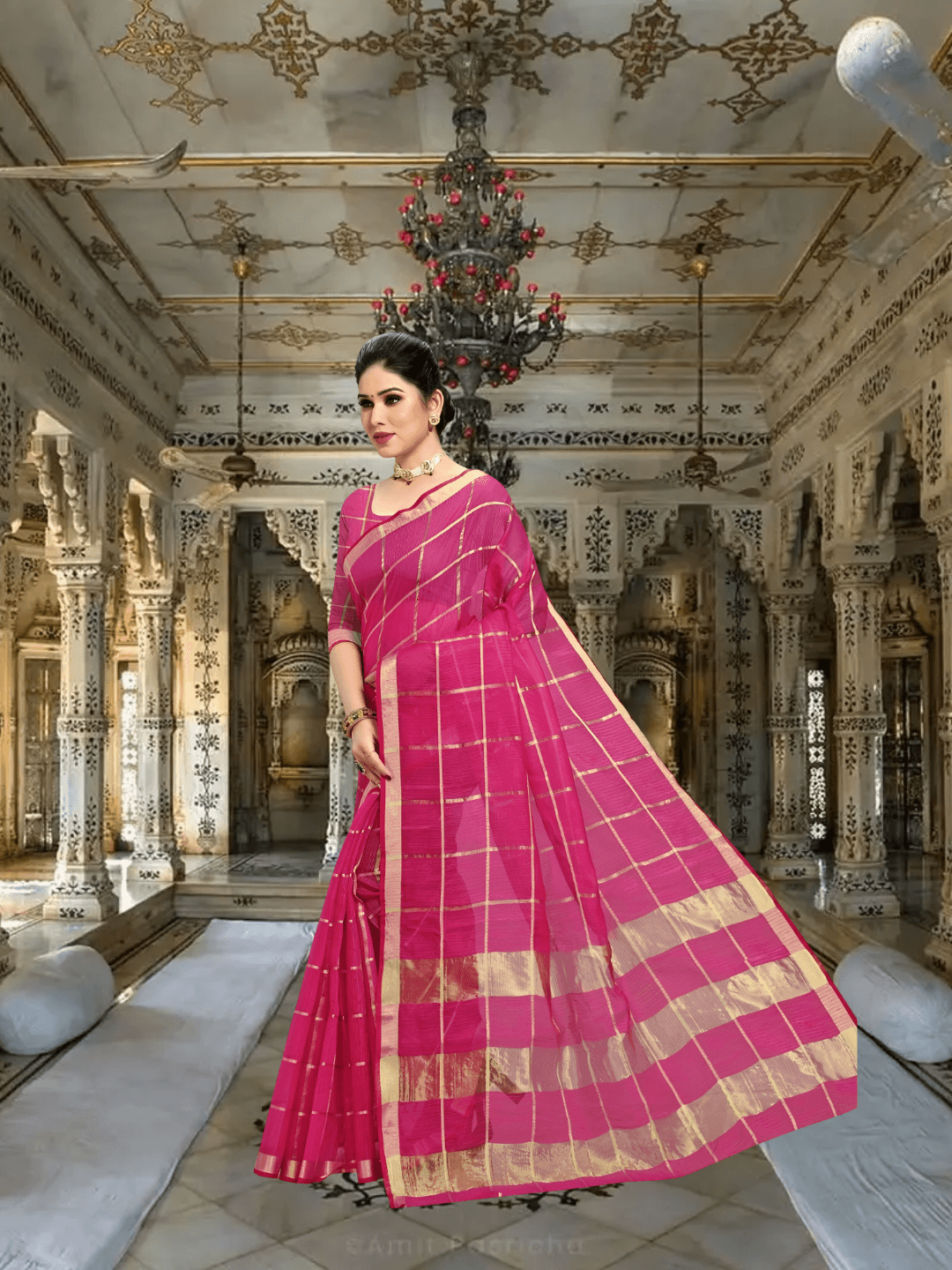 This saree is woven in the blush of devotion, where tradition kisses every square, and heritage shimmers like golden echoes across a pink sky.