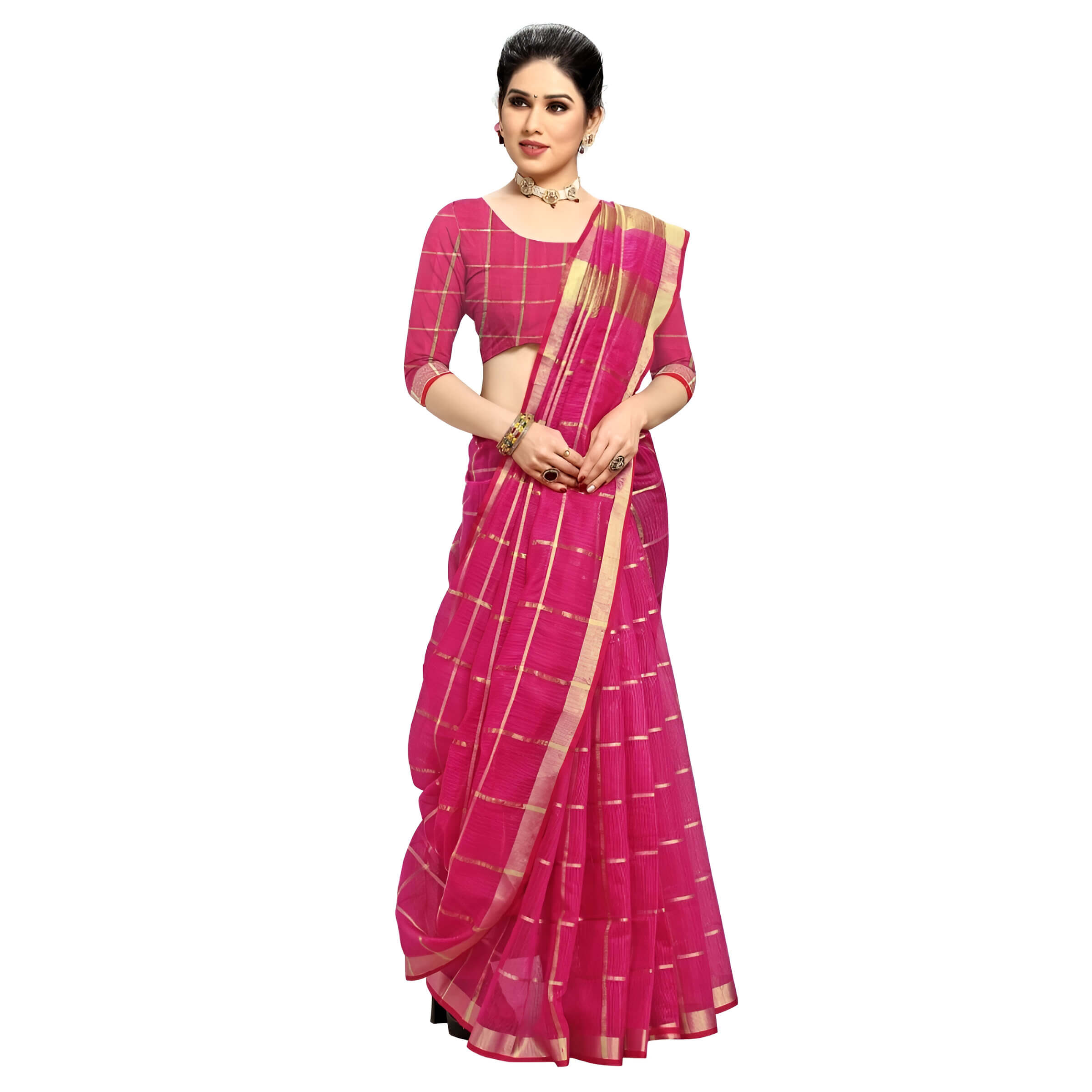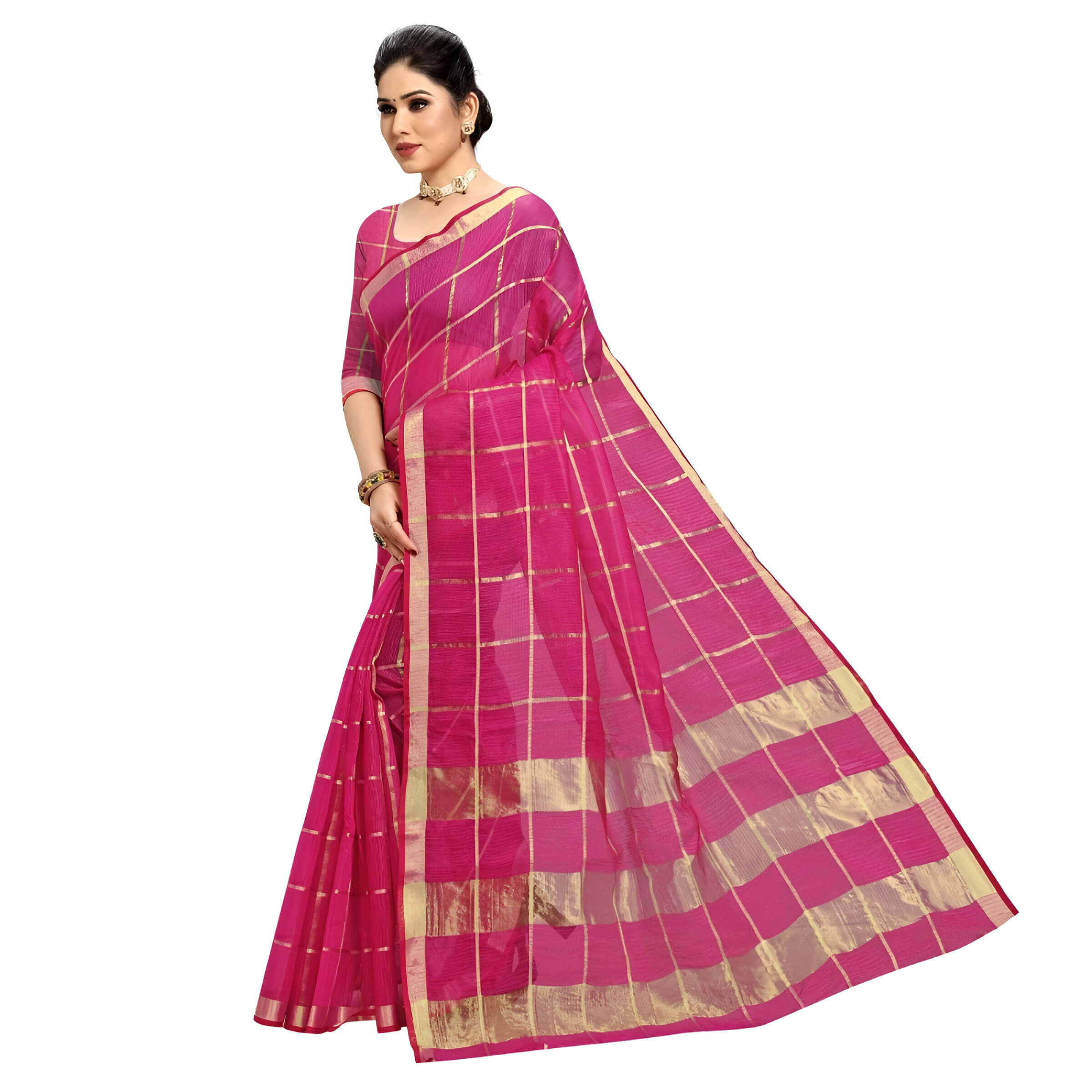 Crafted with the age-old charm of Kota Doria cotton, this saree carries in its weave a weightlessness that feels like a second skin. The golden checks run like divine scripts across its body — a grid of blessings and beauty, while the contrasting red border adds a subtle flame to its softness.