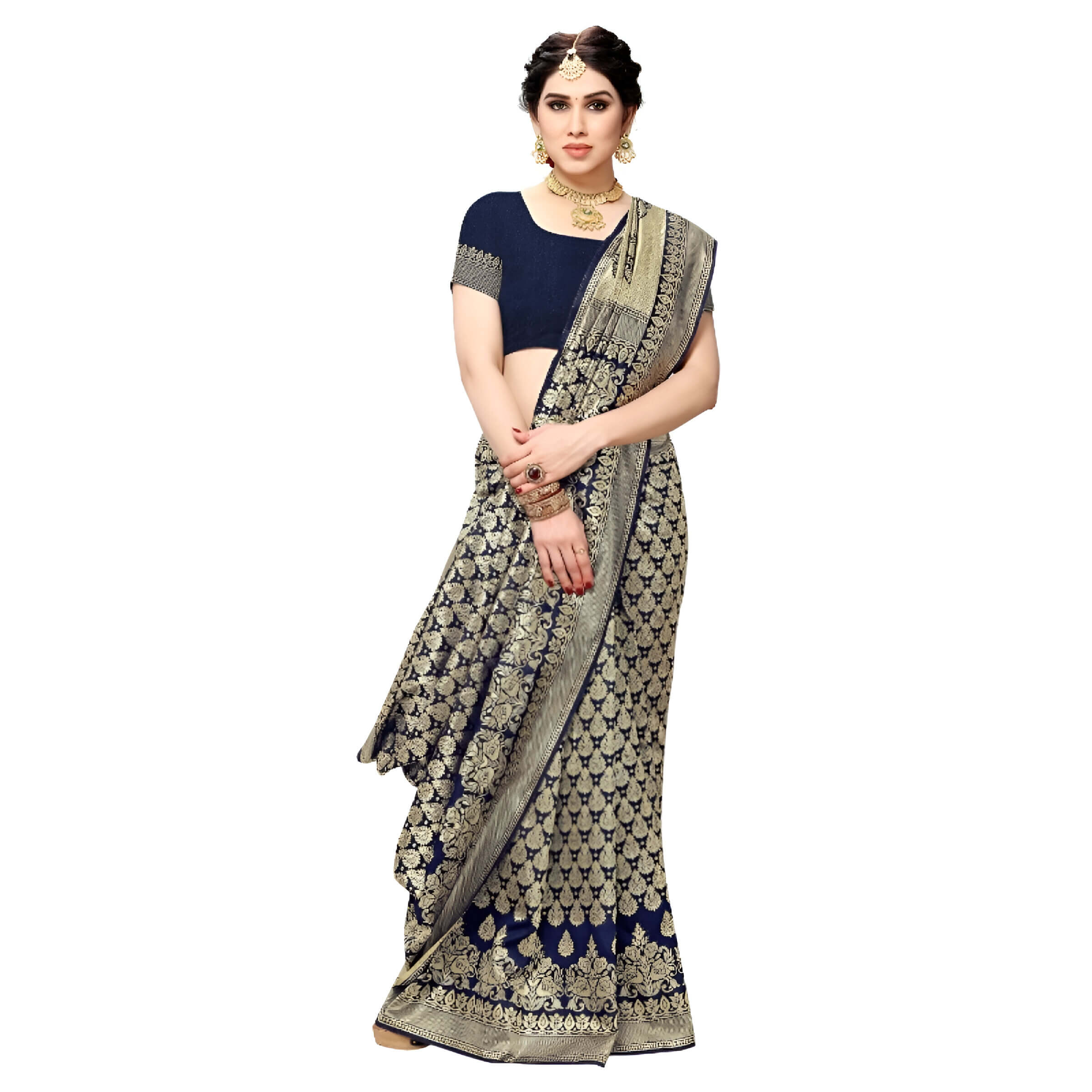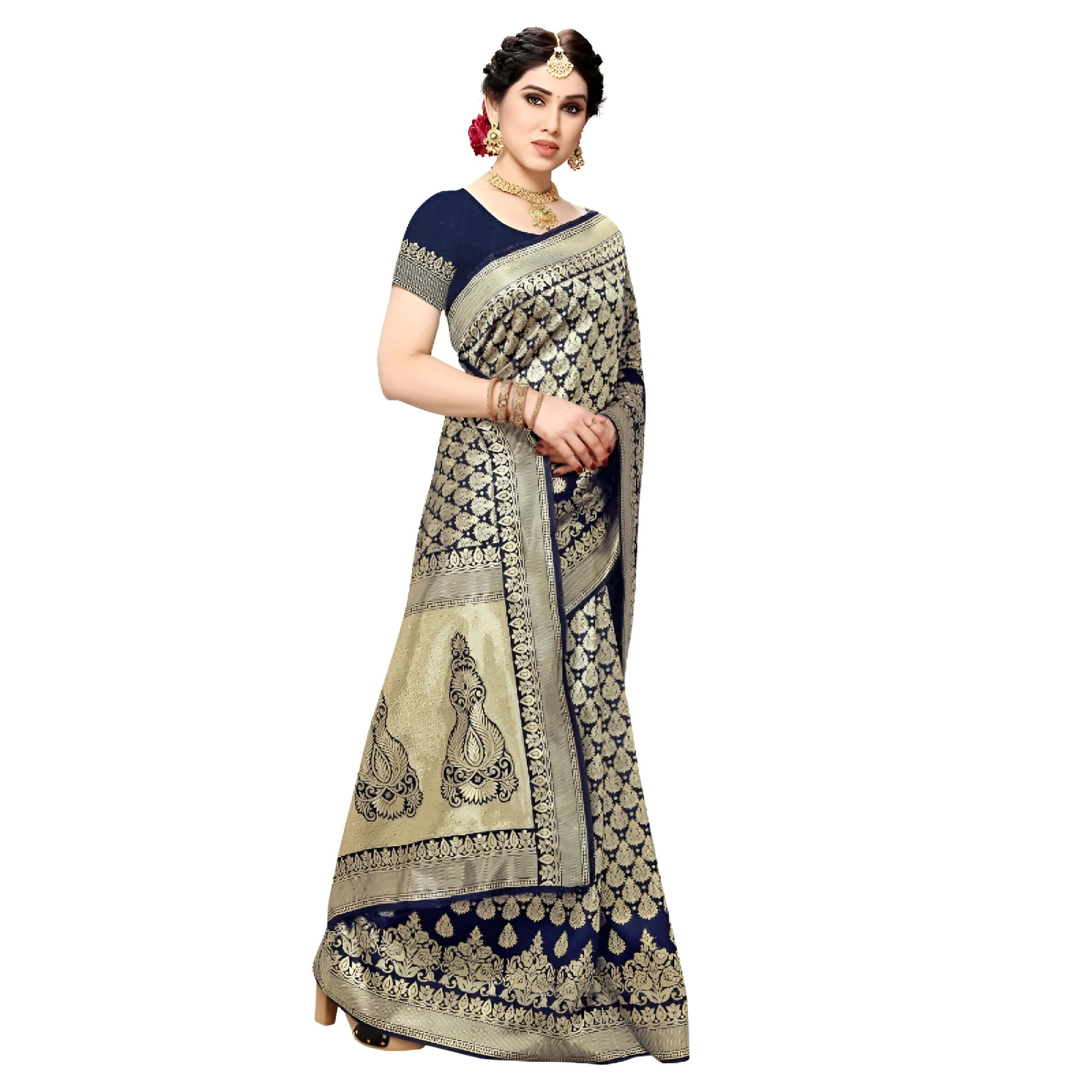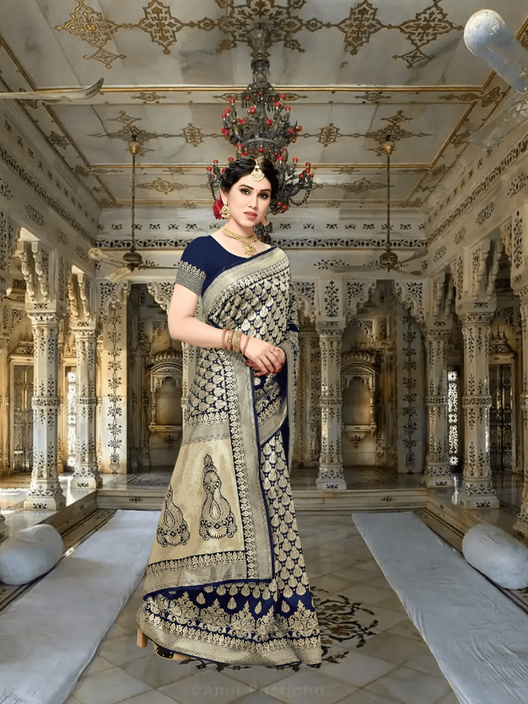 Dive into a world where elegance meets legend. The Imperial Abyss is a navy blue jacquard Kanjivaram silk saree crafted for women who don’t follow tradition — they redefine it.