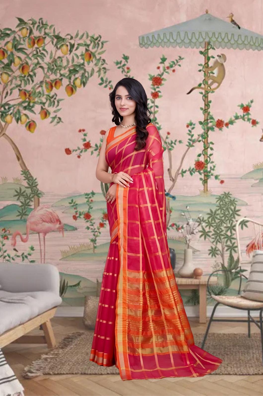 Meet Lalitesha — a deep red Kota Doria saree, structured with checkered grace and elevated by a cotton-silk blend that feels both royal and rooted.