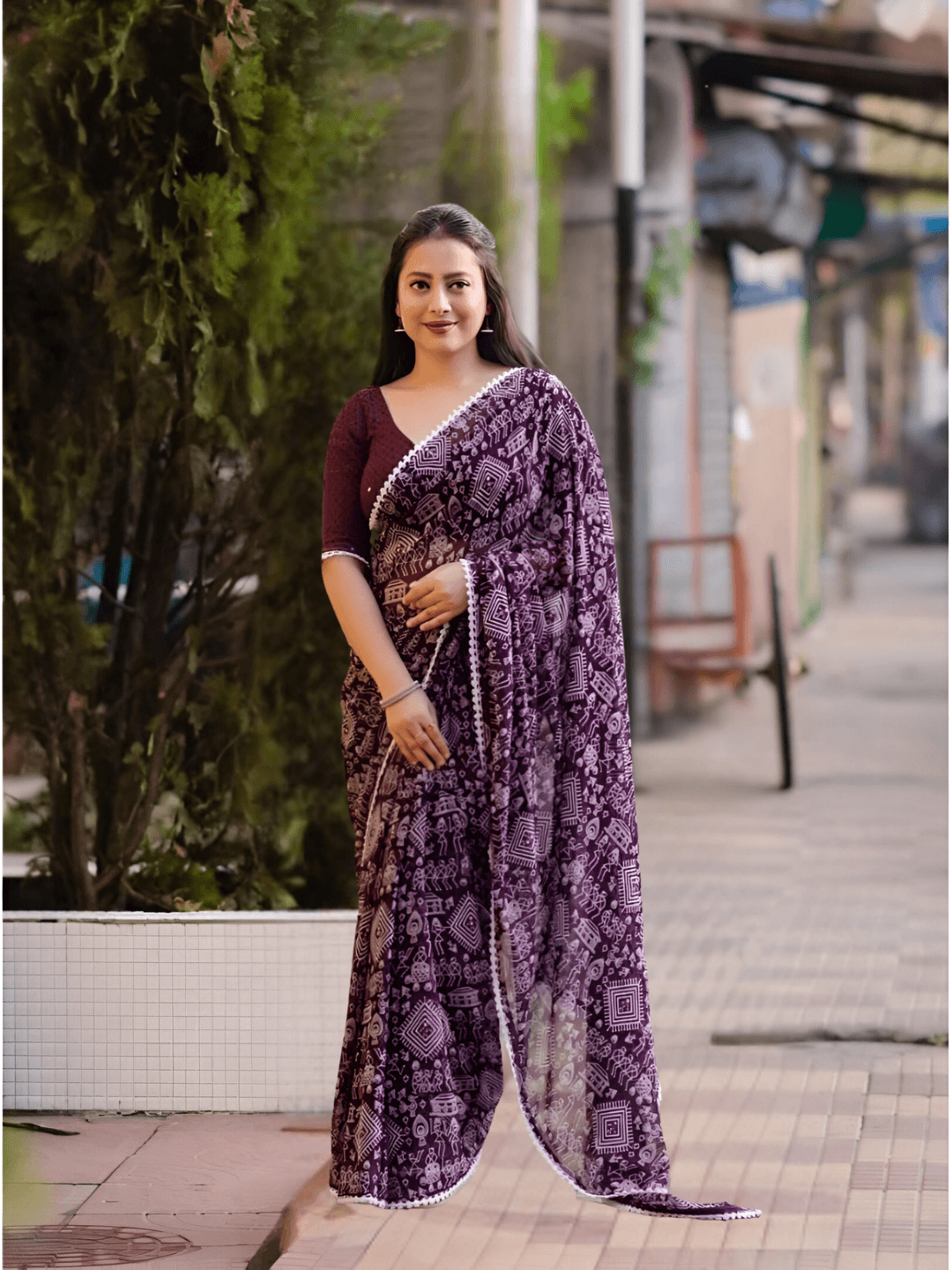 For the woman who wears magic in her folds, this lavender-to-jamun georgette saree is your wearable purple hour. The soft lilac base deepens into royal jamun ombre, like dusk settling over lavender fields.