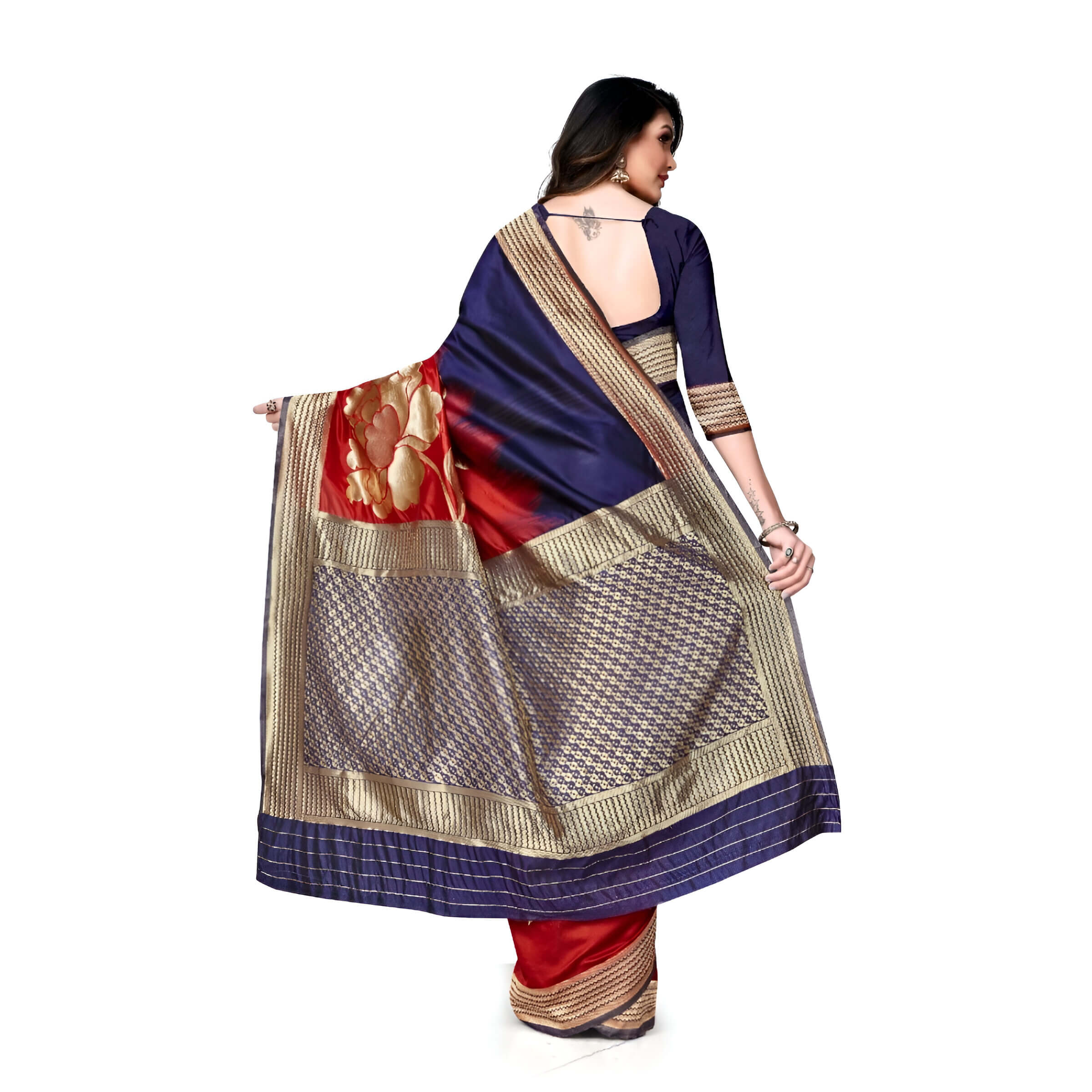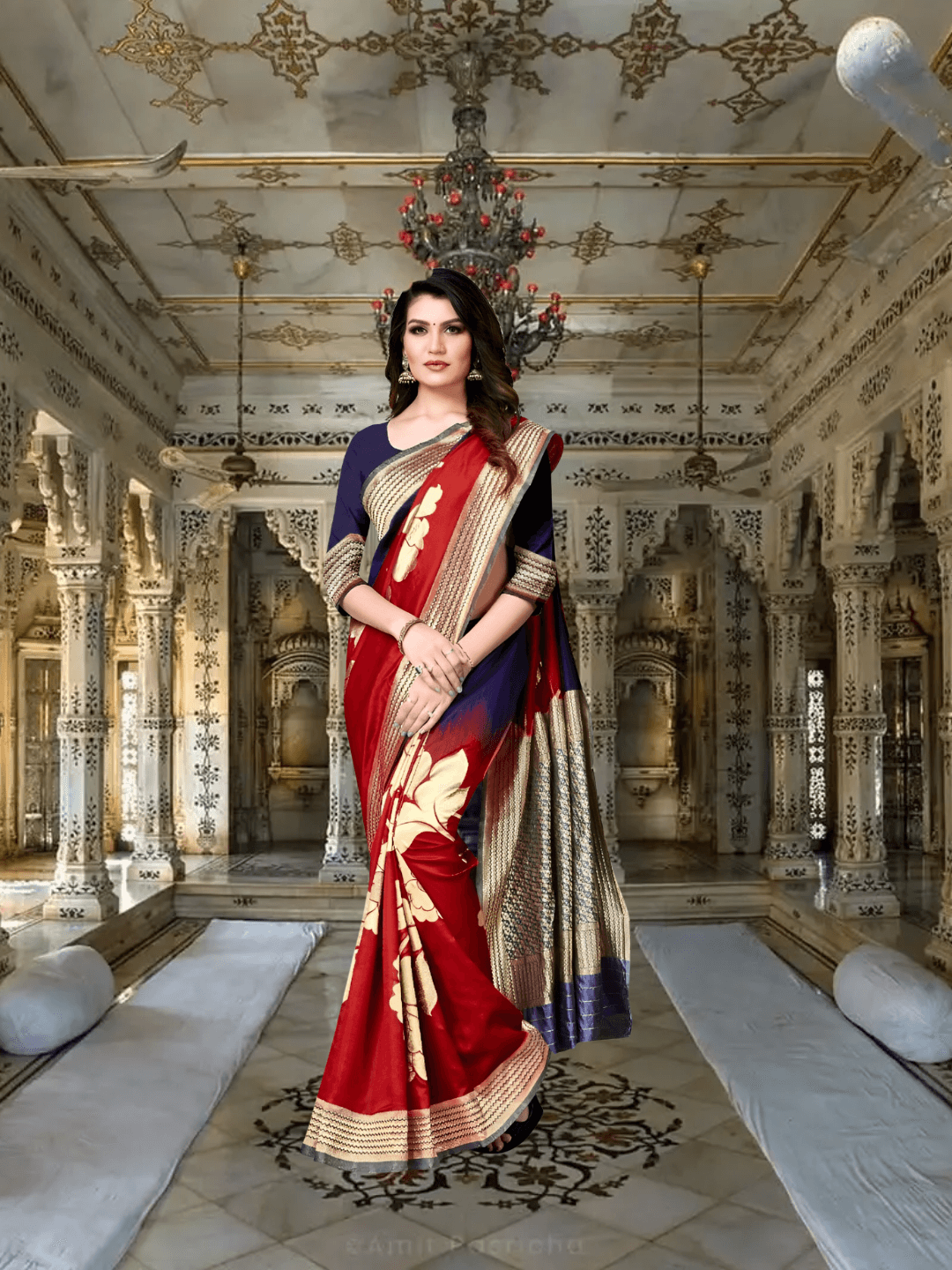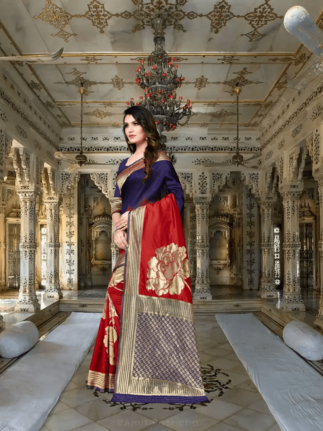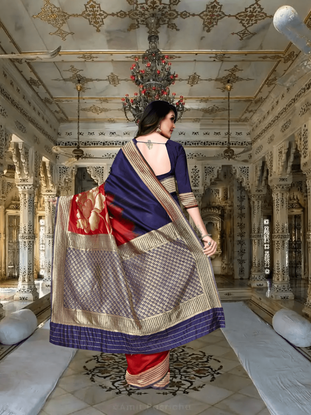 "Midnight Agni" Navy & Red Banarasi silk – Abstract Gold Hem