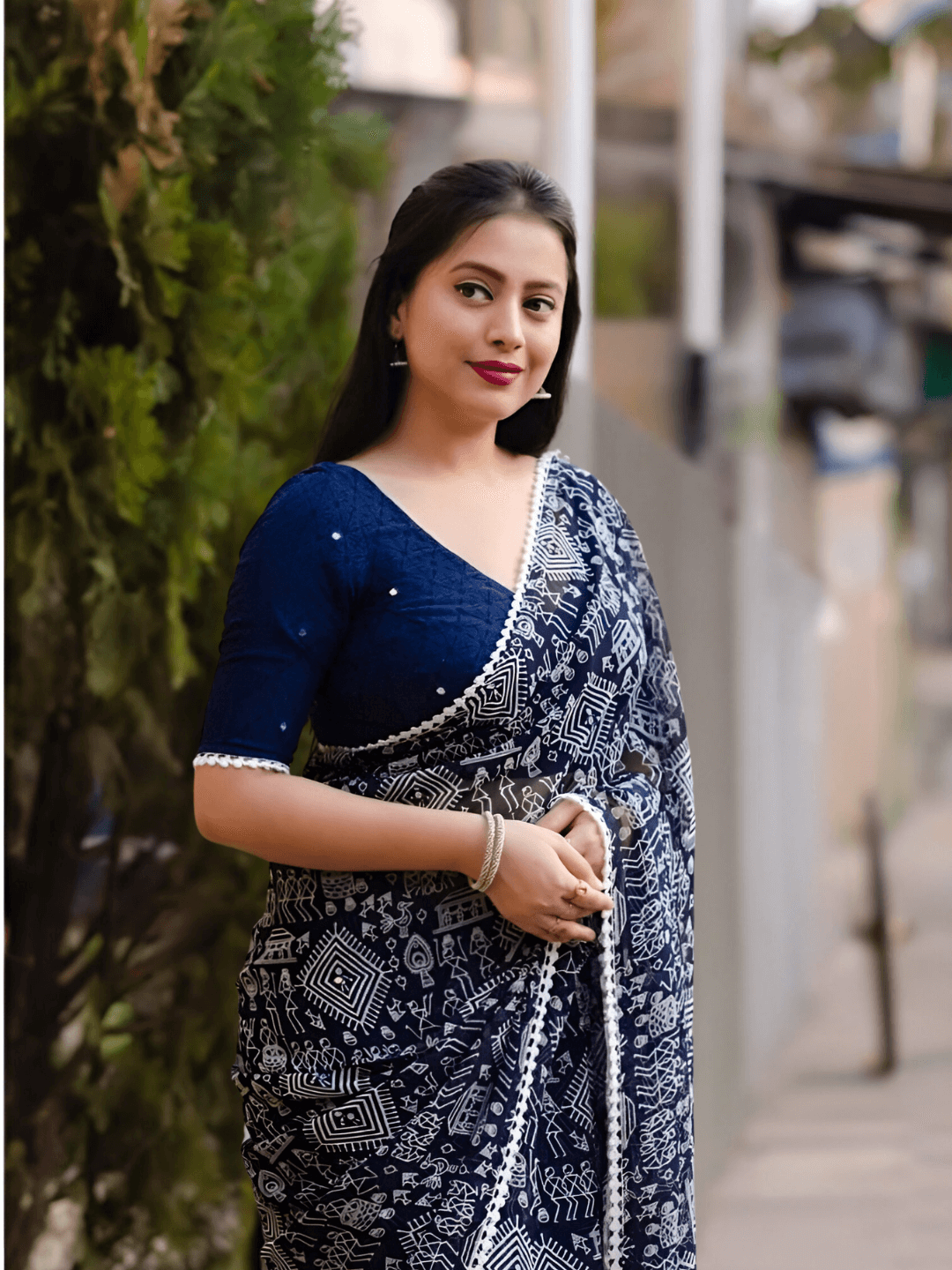 "Midnight Sonata" Navy Blue Georgette Saree – Cosmic Ombre
