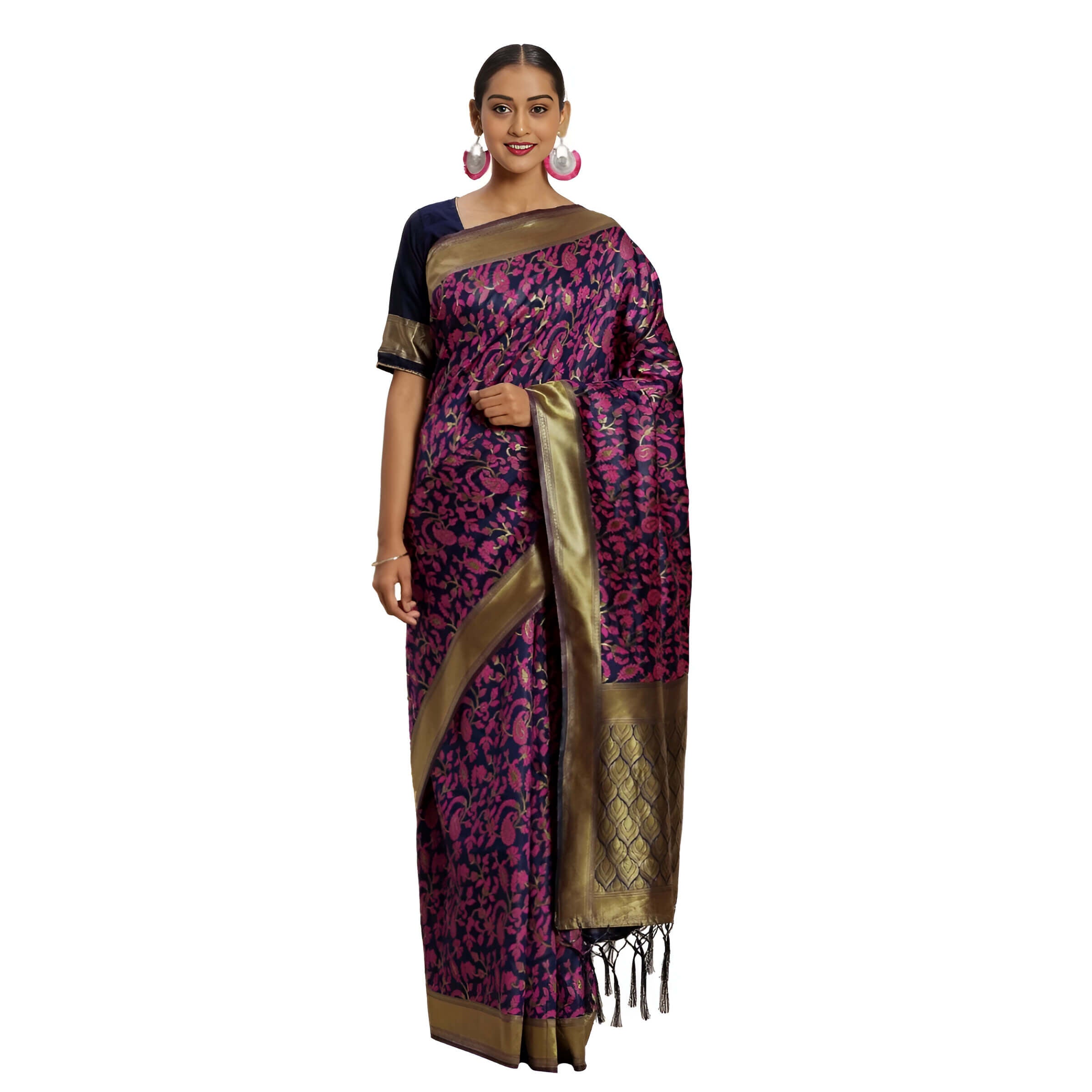 The Nocturne Nartaki is a rare vision in Banarasi silk — where shadows of night bloom into artistry. A deep navy canvas, drenched in neon-pink floral motifs, and wrapped with a luxurious golden zari border that sways like temple bells in a dancer’s rhythm.