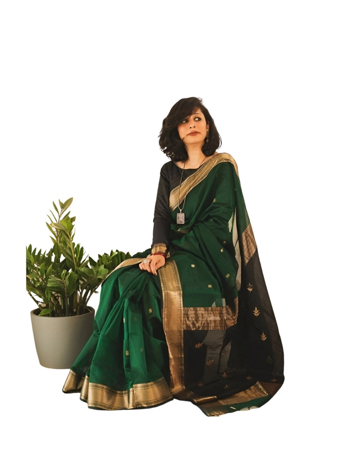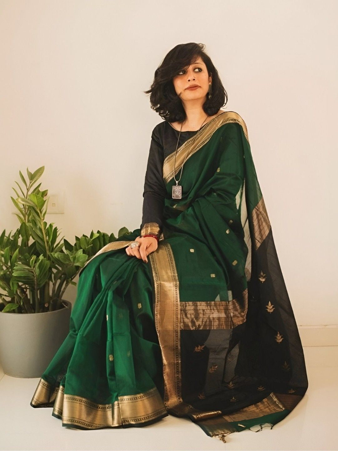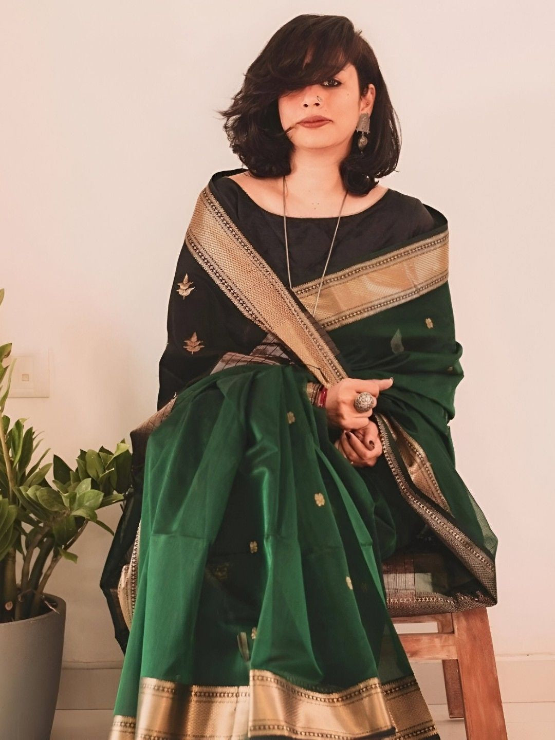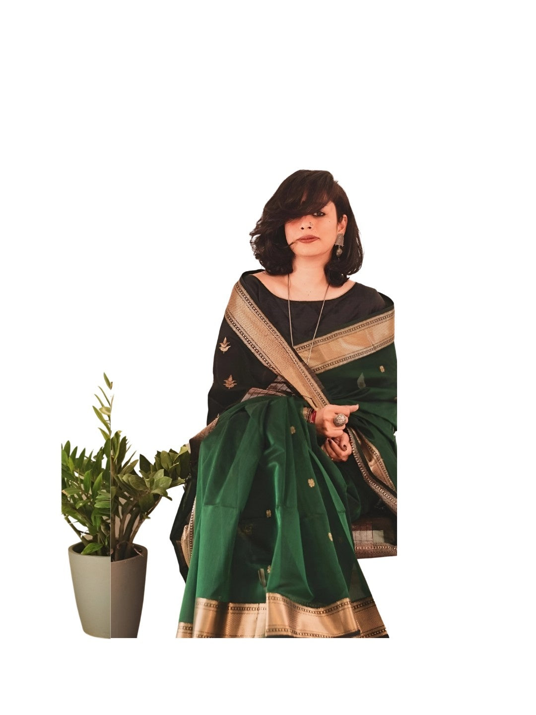 Noor-E-Zehen—where silk speaks with sophistication. Its dark green base breathes regality, while delicate prints mirror a soul steeped in subtle grace.