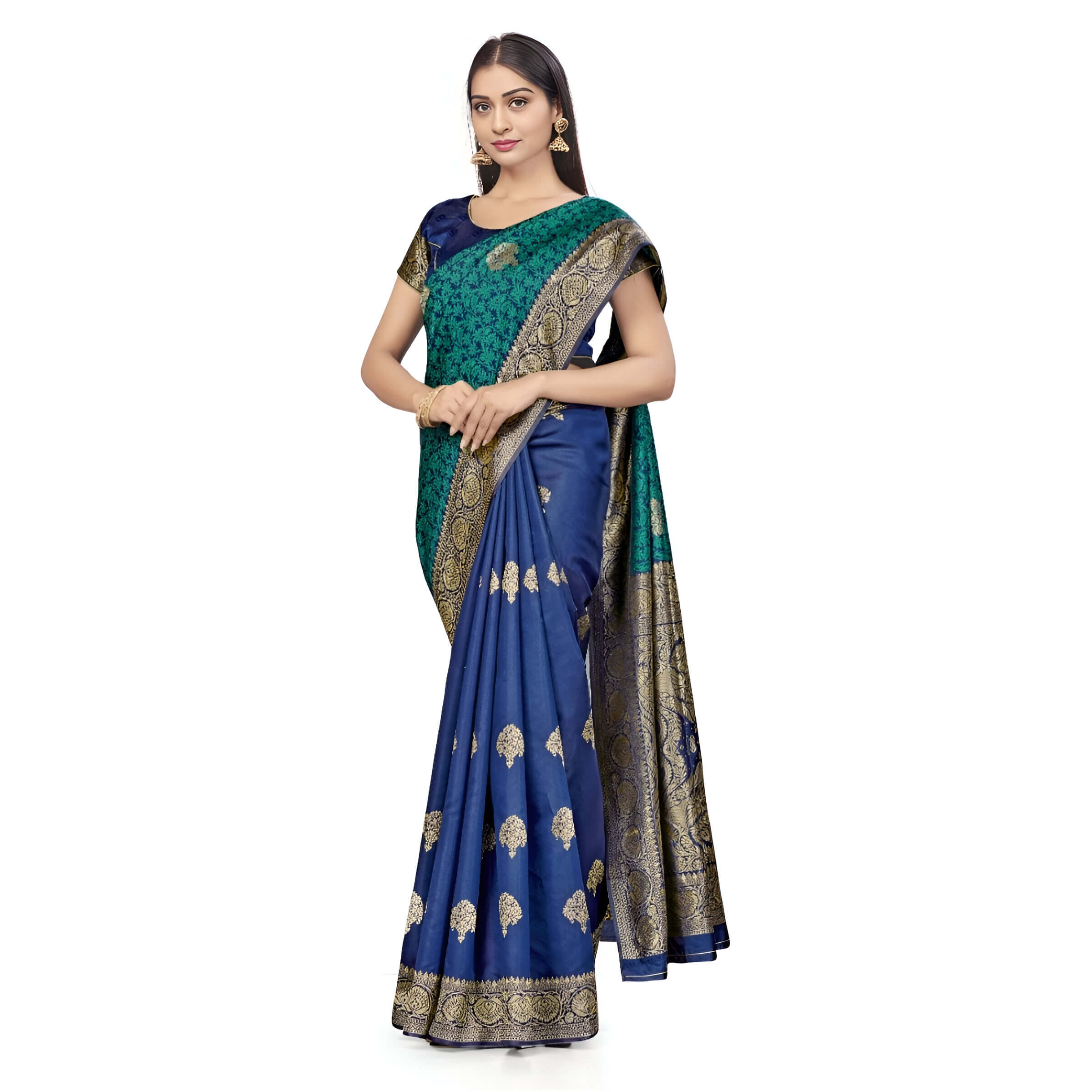 "Oceanic Rama" Blue-Green Banarasi Silk – Gold Celestial Borders