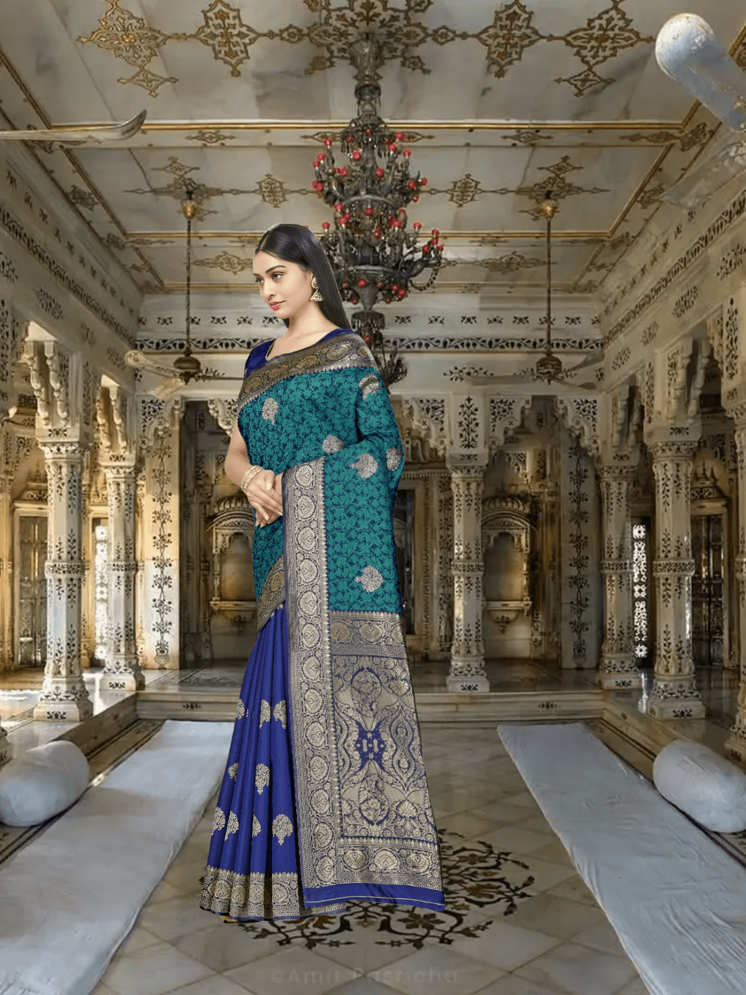 For the woman who wears divinity, this Banarasi is Varuna’s ocean meeting Rama’s forest. The abyssal blue melts into emerald not at a seam, but in liquid chromatic warfare, while the gold borders don’t just shine—they carve space like vajra weapons.