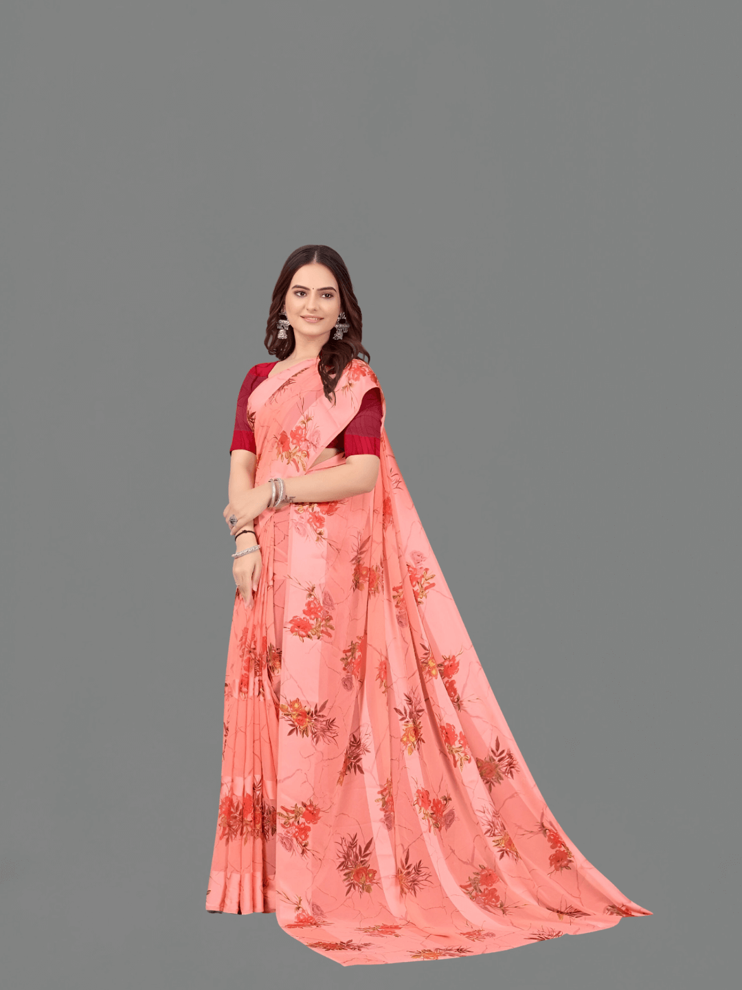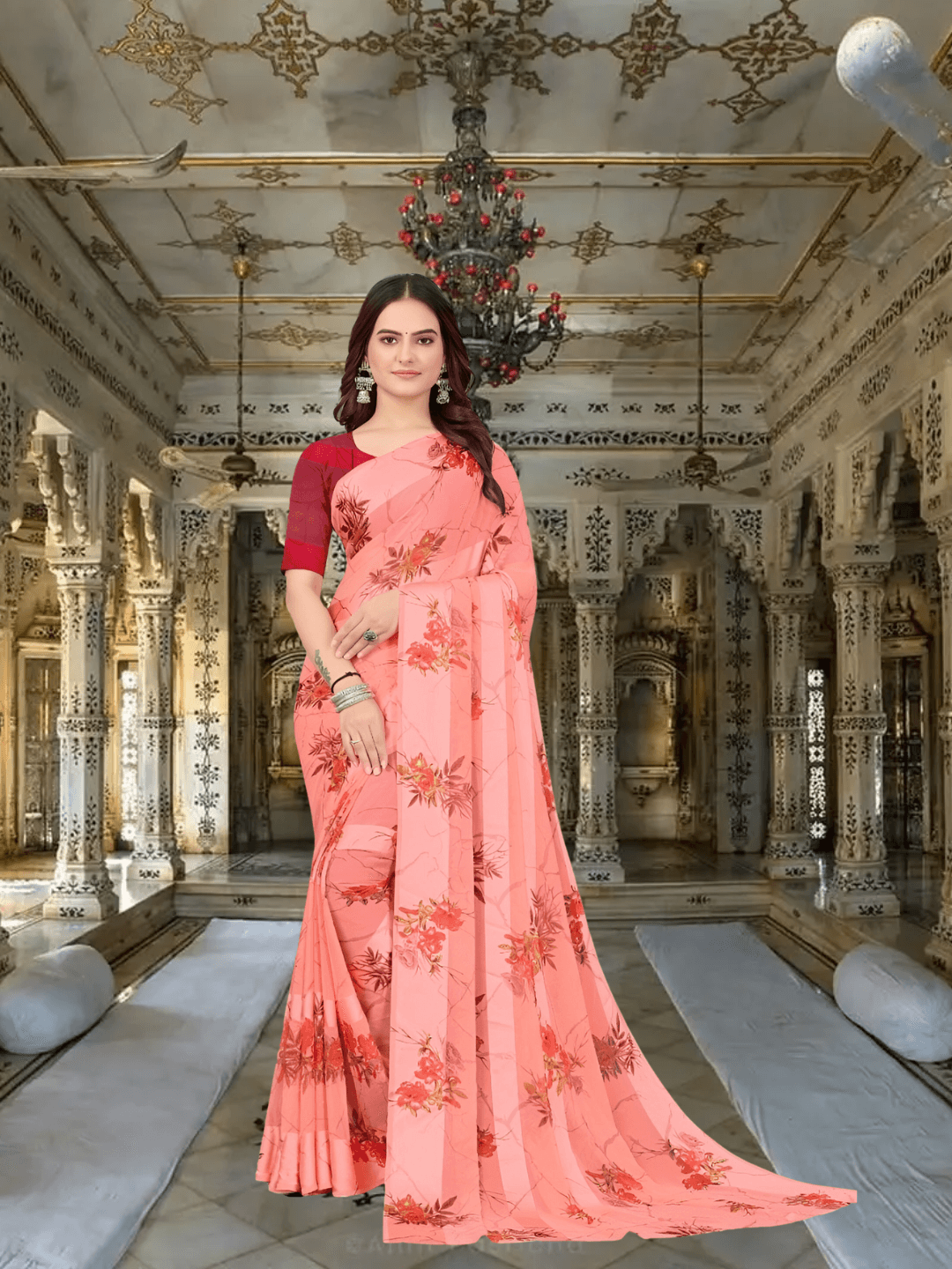 Opulent Peach Satin Patta Saree –Royal Printed Floral Elegance