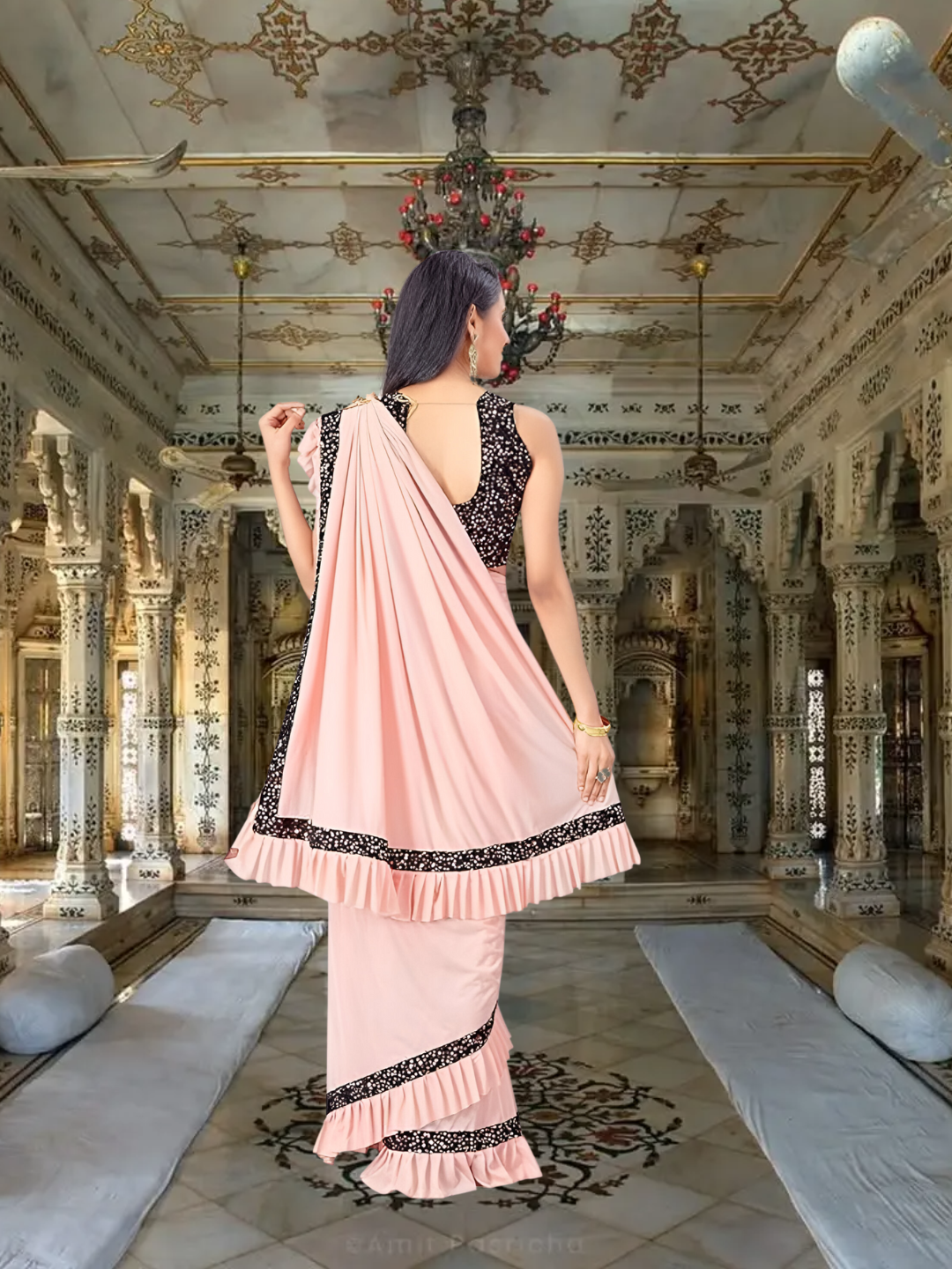 This peach Lycra saree is the ultimate transitional piece for the modern woman:
