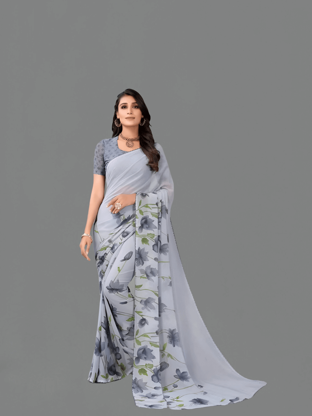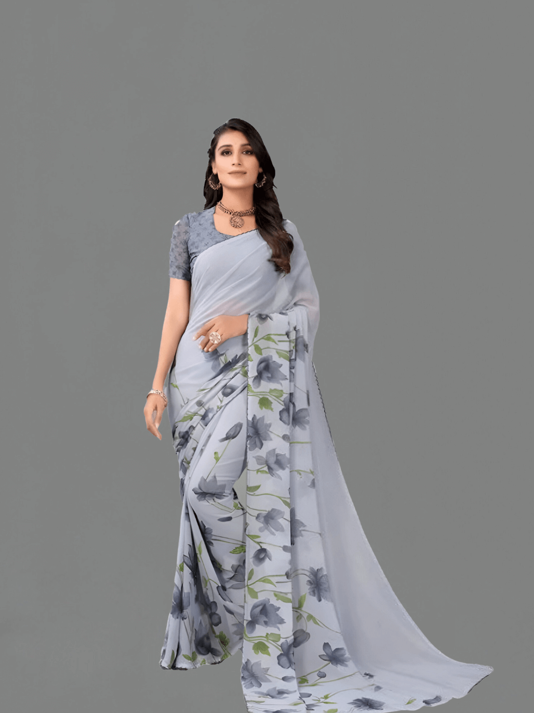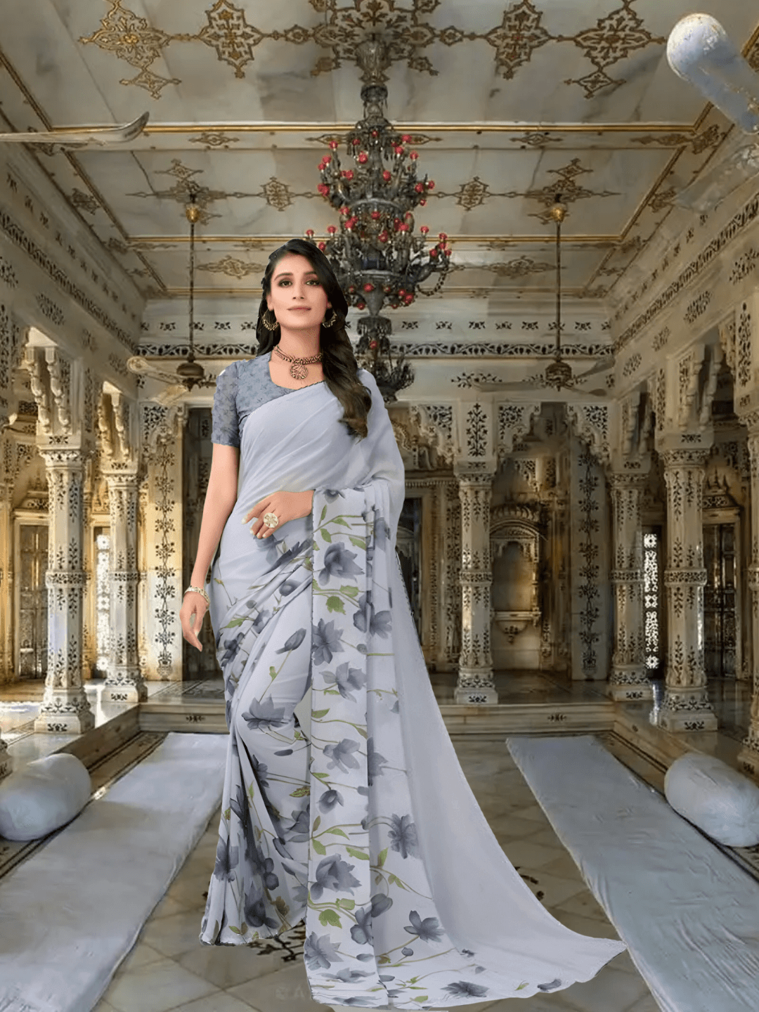 For the woman who wears freshness like a second skin, this white floral georgette saree is your walking spring garden. The pristine white base blooms with subtle grey-tone florals, paired with a soft grey blouse for modern contrast.