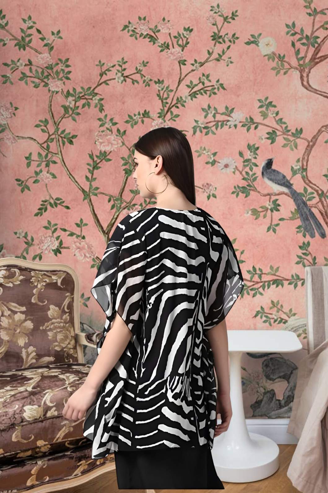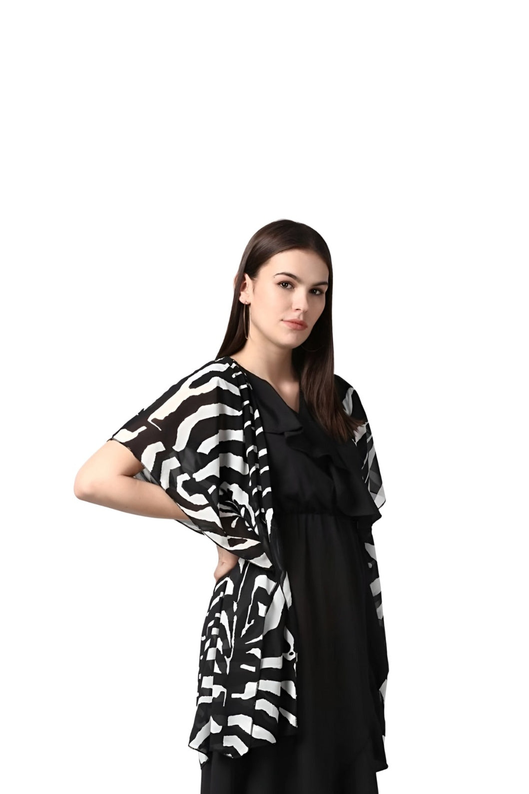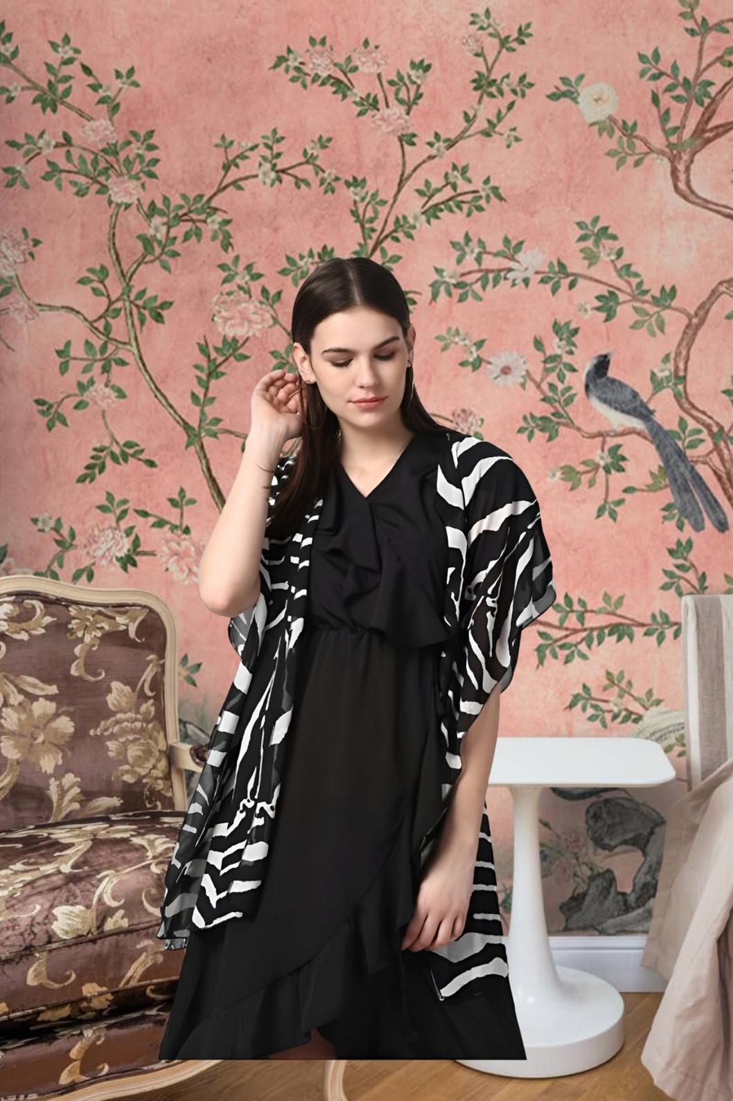 CELESTINA’s Prakash Vritta isn’t just a shrug. It’s the final word in effortless layering. Short sleeves. Lightweight polyester. Printed black perfection.