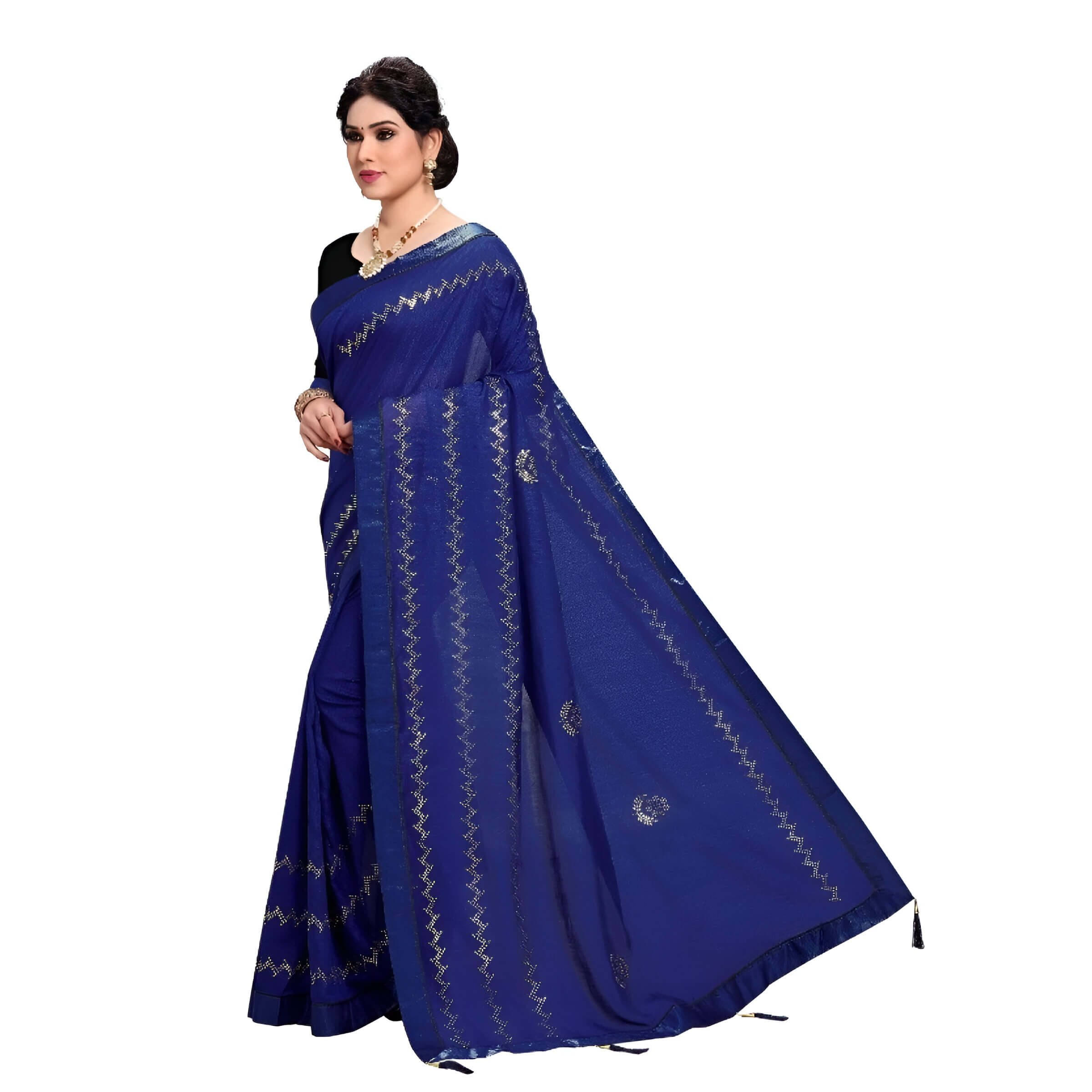 Introducing Raatrani Raga, a saree woven from twilight’s secrets and stitched with stories only the night knows. Crafted in luscious Vichitra silk, this navy blue marvel carries a quiet opulence — a hush of elegance, a whisper of allure.