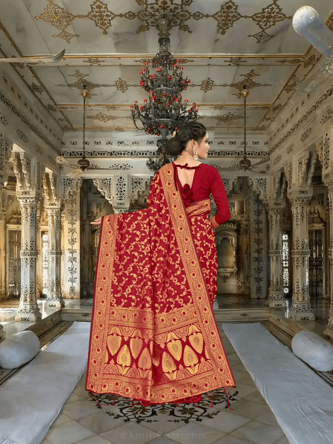 "Rouge Radiance" Bright Maroon Banarasi Silk – Sunlit Gold Florals