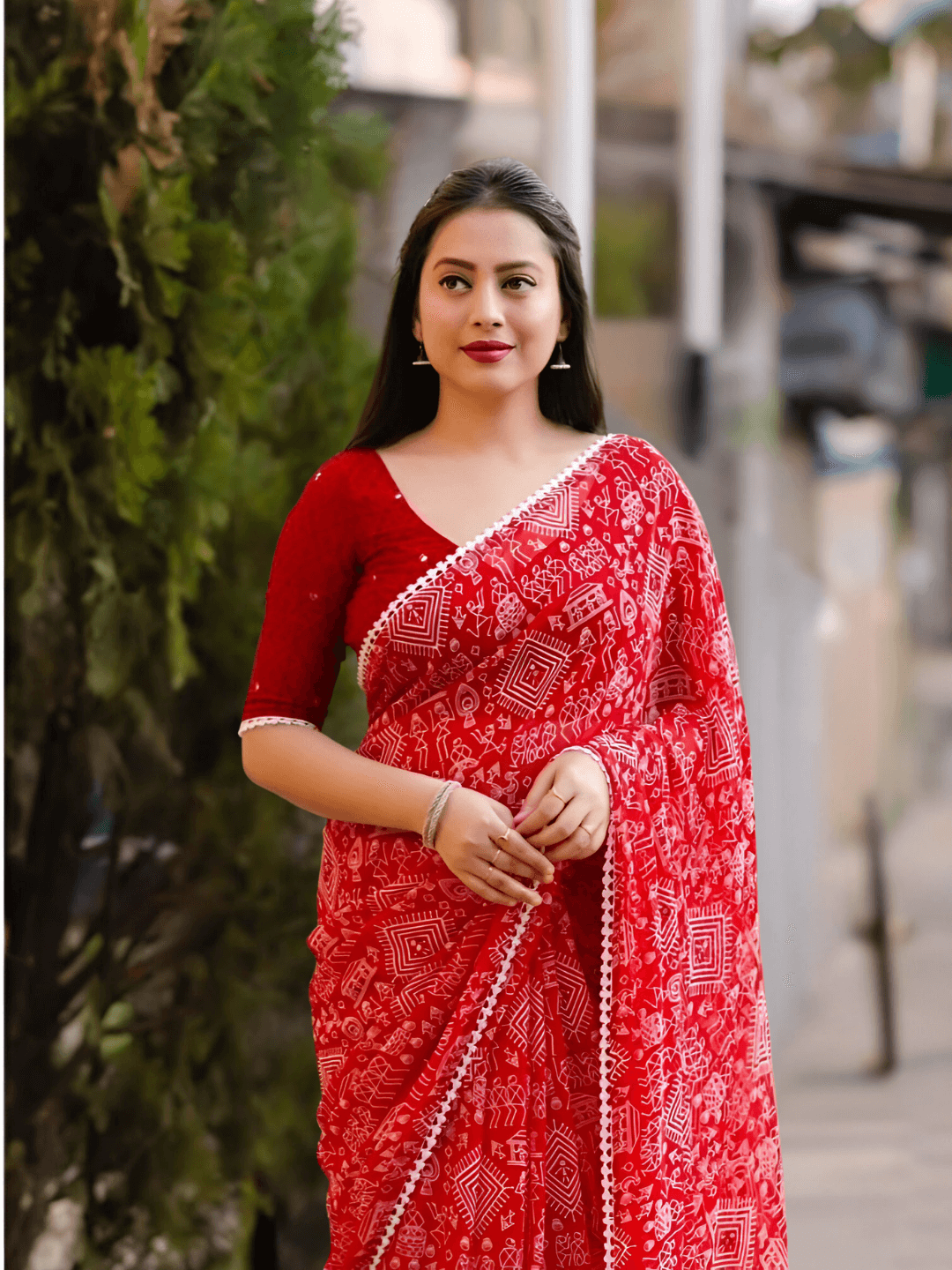 For the woman who treats fashion as her gallery, this red georgette saree is your wearable statement piece. The vibrant scarlet base dances with unconventional abstract patterns – think Picasso meets Indian tradition.