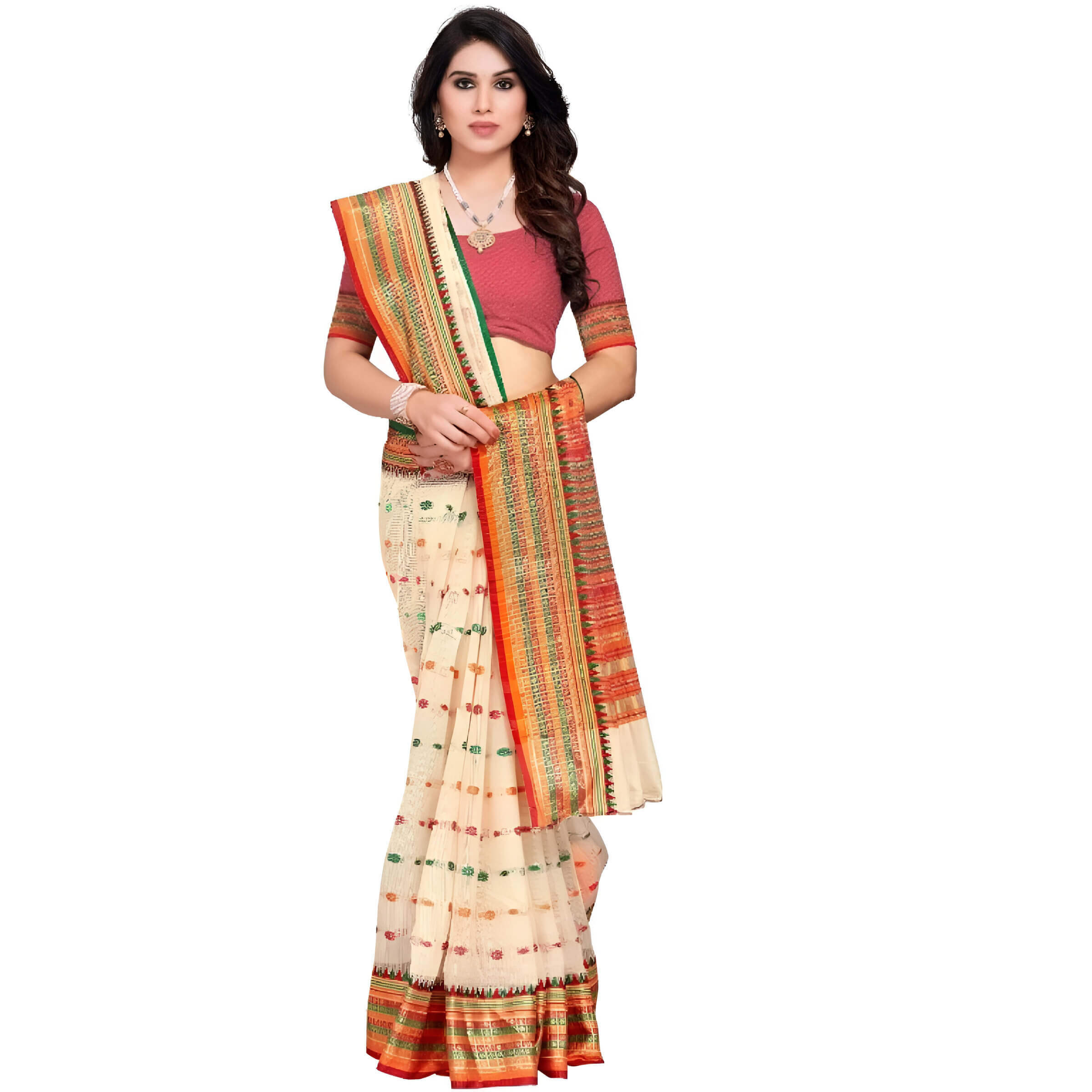 I bought 2 sarees together. Both are decent. Wore one for Onam. The fall is done well. No loose threads. Easy to manage even for someone who doesn’t wear sarees often.