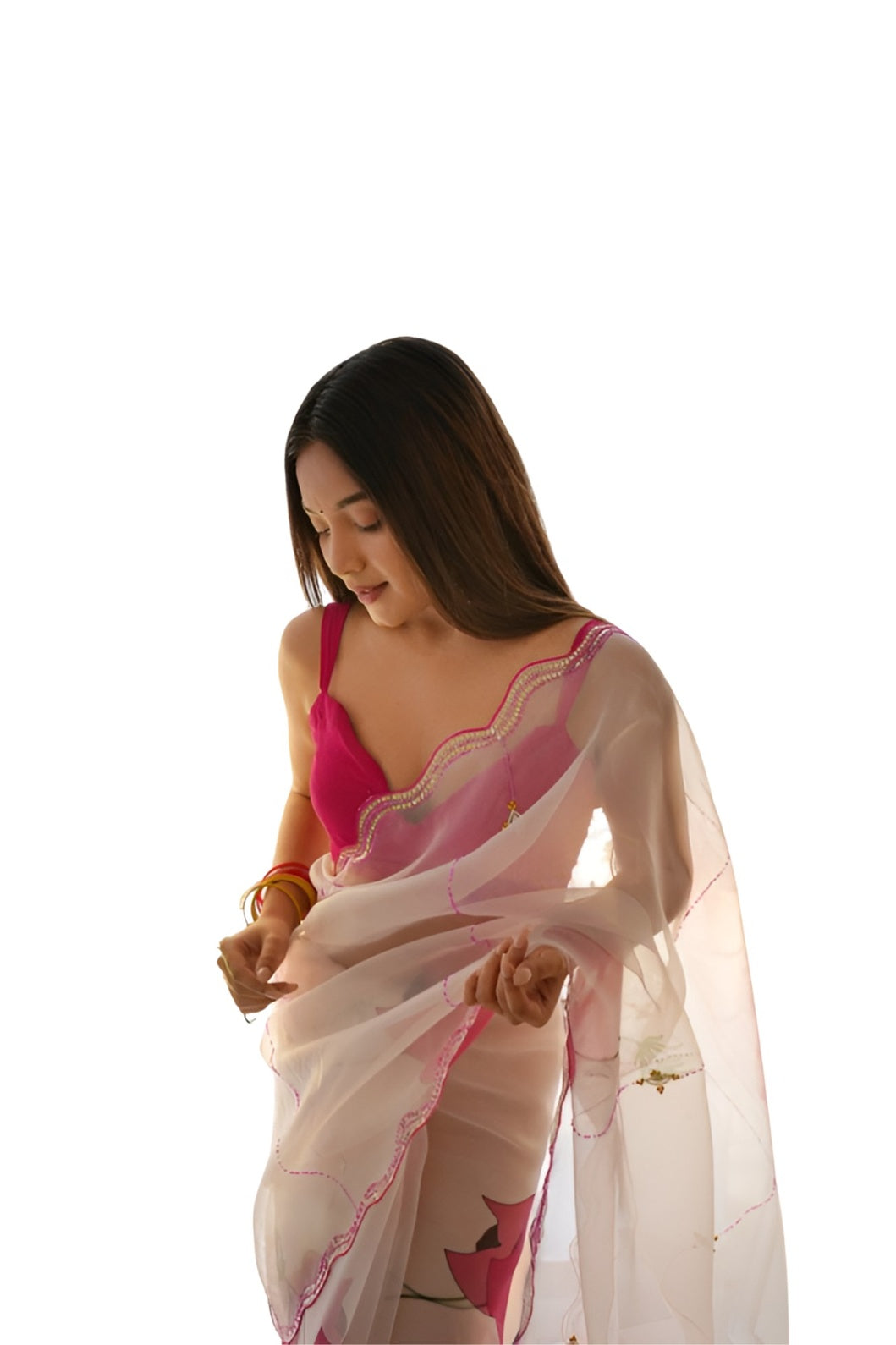 The Snowdrift Bloom is a sheer white organza saree scattered with soft floral prints. Ethereal. Weightless. Powerful. It captures that untouchable elegance you only see on runways and dreams. Glide through occasions like a secret the universe kept.