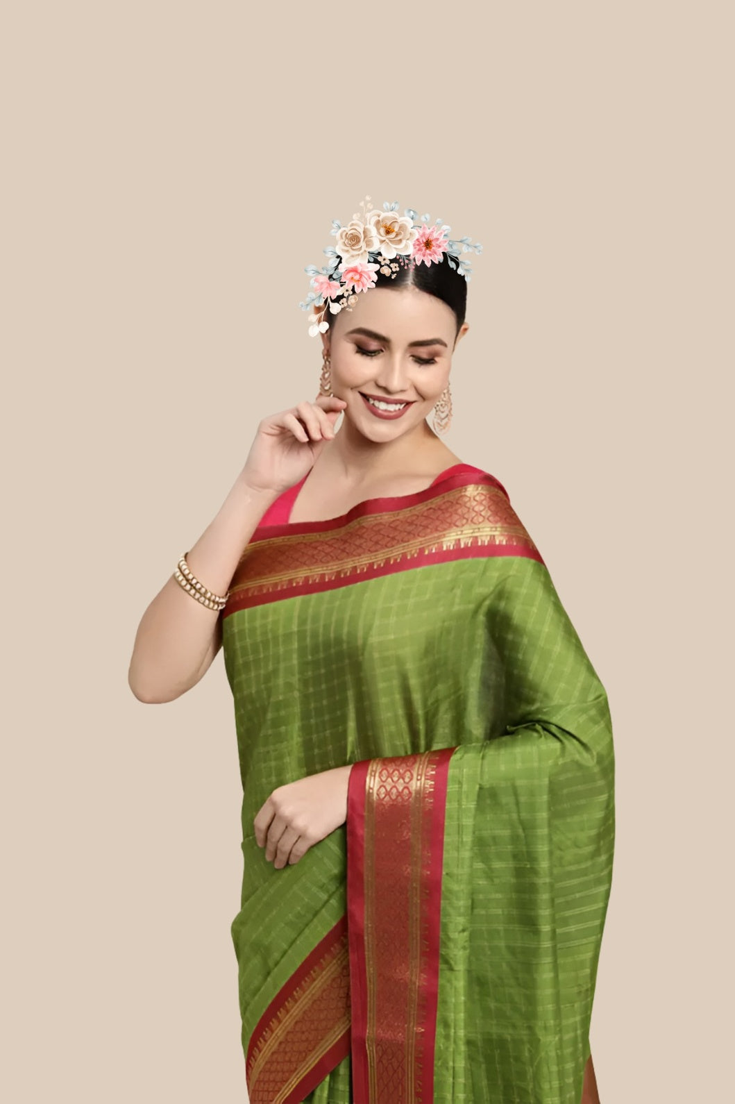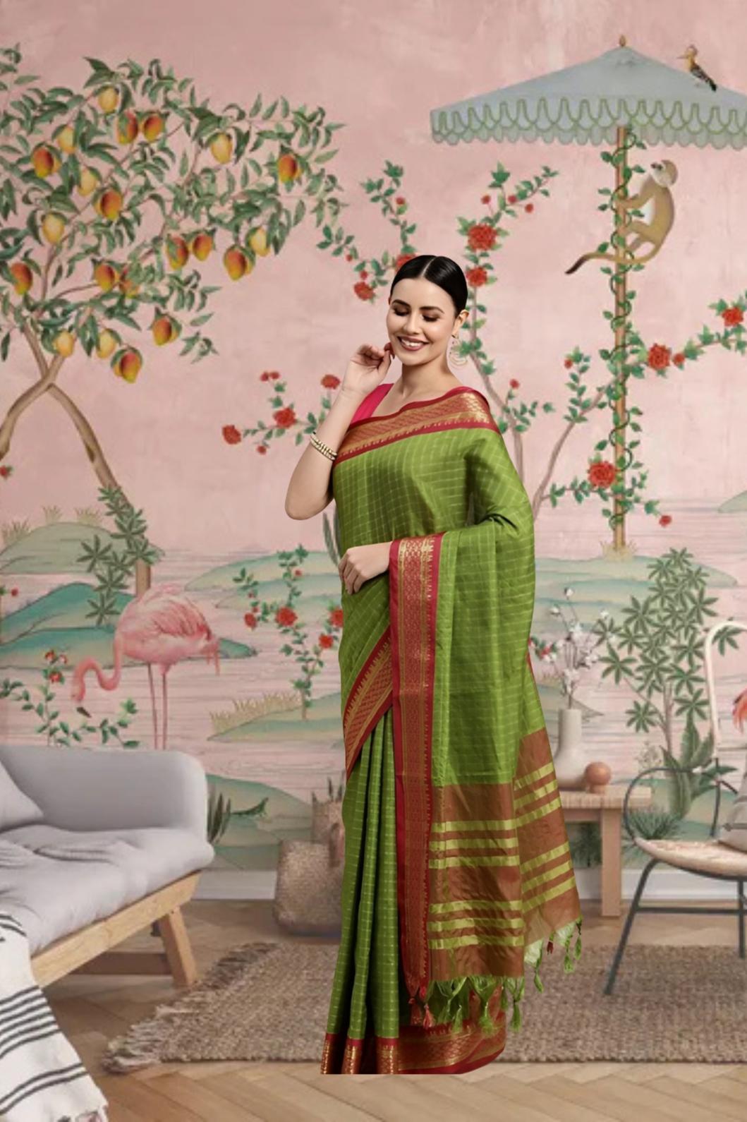 Her checkered white base carries airiness, while the earth-rich Mehendi green borders root you in ritual, radiance, and soul.