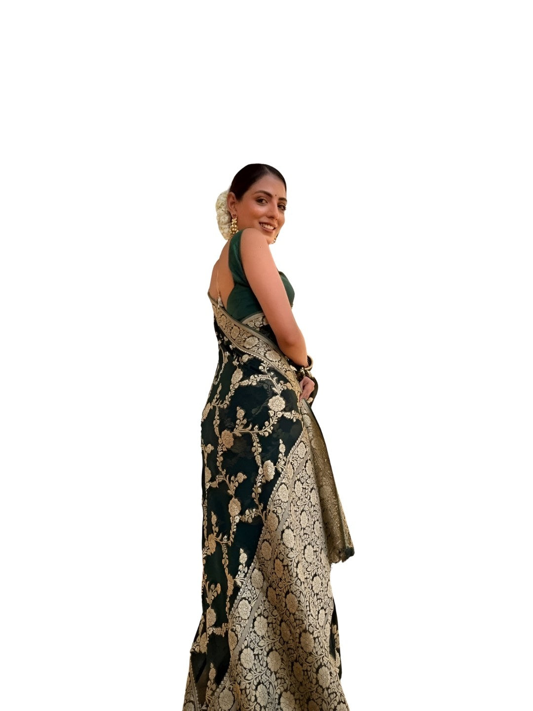 A deep, forested green kissed with intricate prints—Varnika Viridian is silk woven into poetry. This saree blends quiet opulence with everyday versatility, made for women who speak in elegance, not volume.