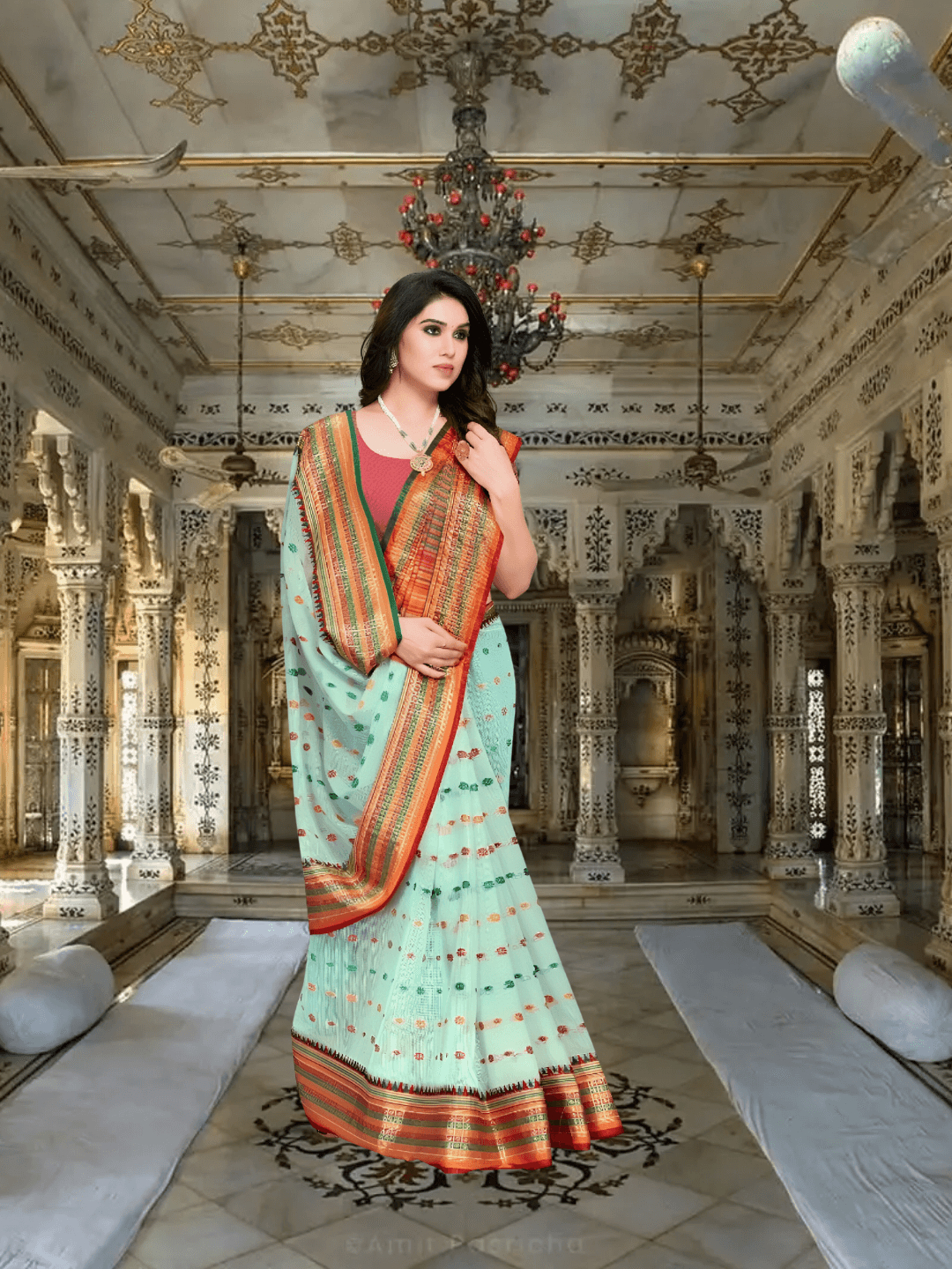 Meet Vrinda Varnika, a soft-spoken symphony in weave, drawing inspiration from dew-lit courtyards and quiet temple steps. This Kota Doria cotton saree in pista green isn’t just a garment — it’s a moment of calm made wearable.
